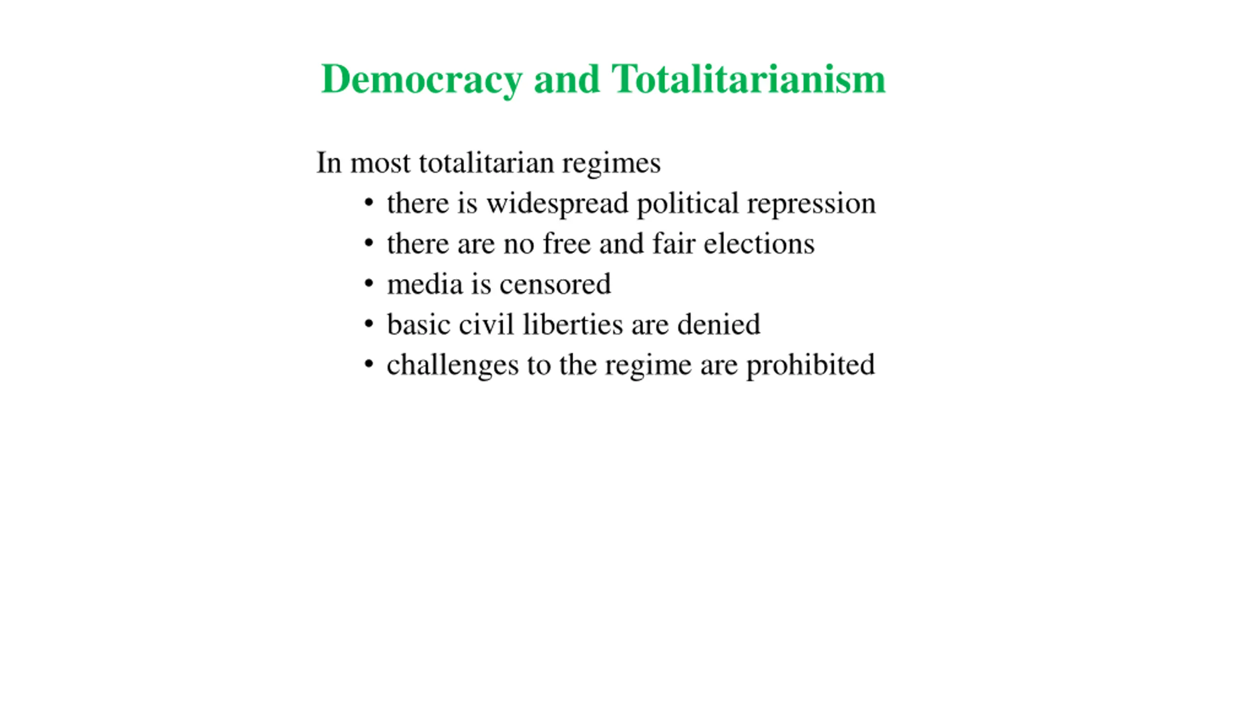 Democracy and Totalitarianism In most totalitarian regimes there is widespread political repression there are no free and fair elections media is censored basic civil liberties are denied challenges to the regime are prohibited