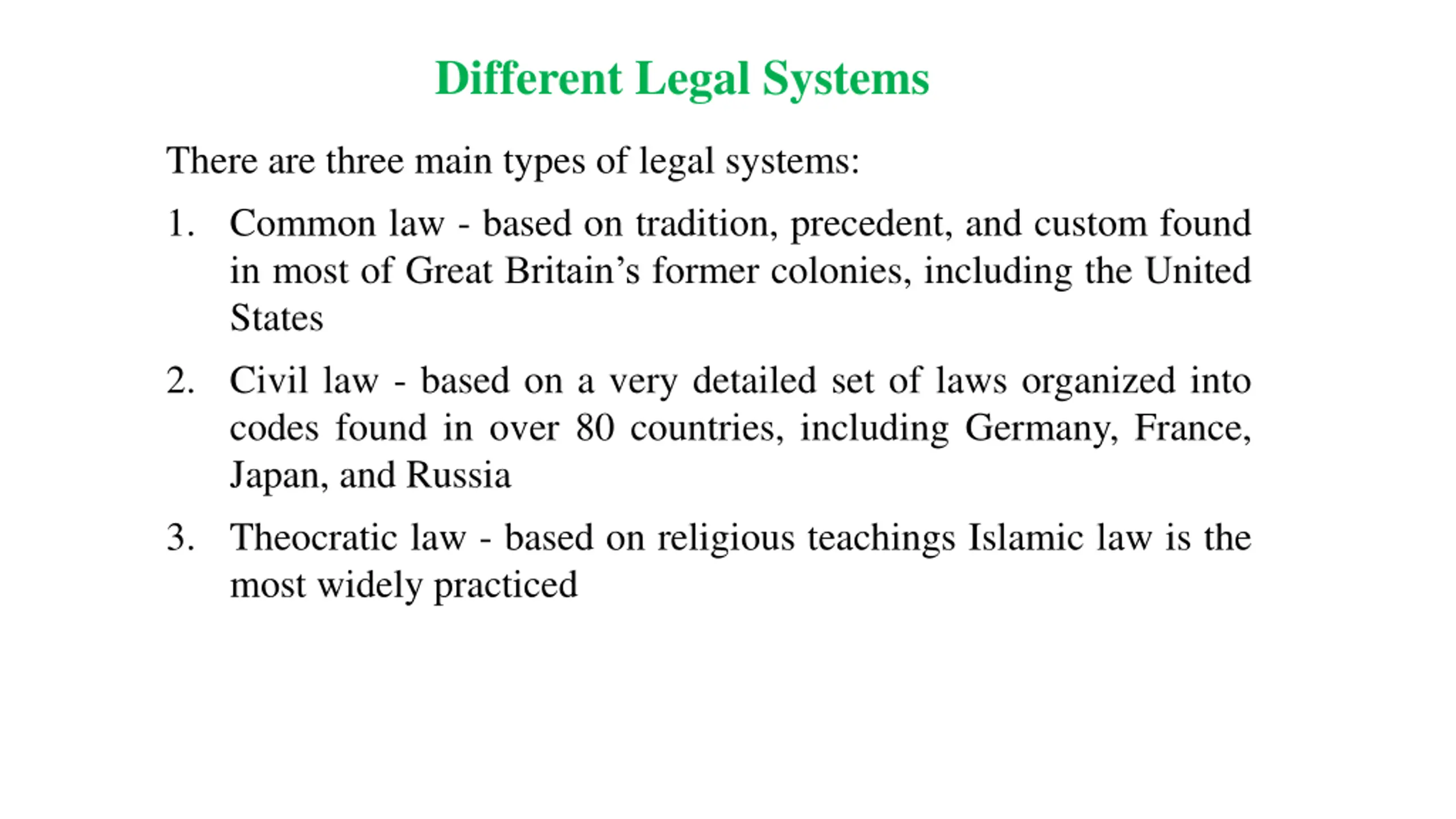 Different Legal Systems There are three main types of legal systems: 1. Common law - based on tradition, precedent, and custom found in most of Great Britain s former colonies, including the United States 2. Civil law - based on a very detailed set of laws organized into codes found in over 80 countries, including Germany, France, Japan, and Russia 3. Theocratic law - based on religious teachings Islamic law is the most widely practiced