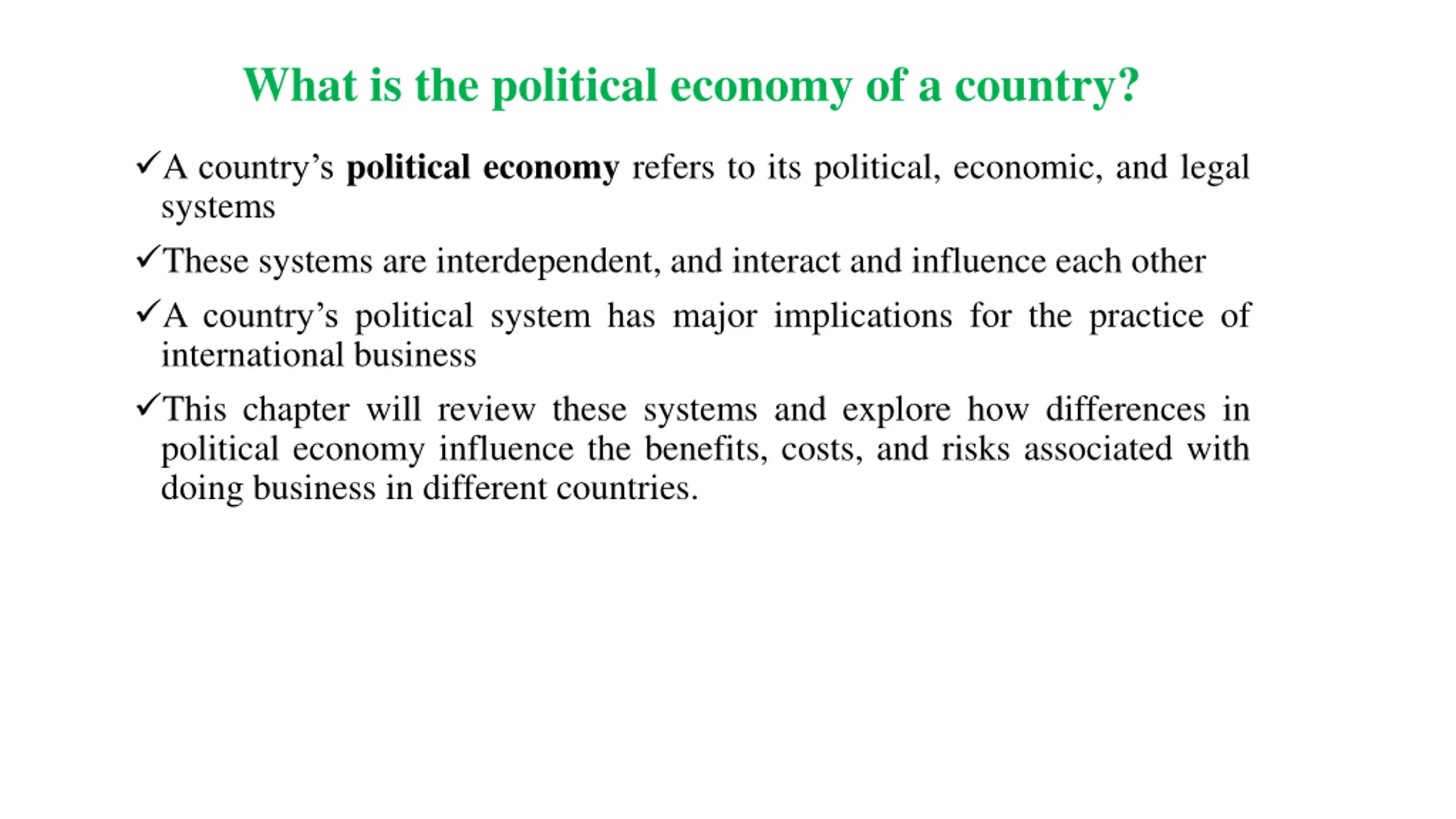 What is the political economy of a country? A country s political economy refers to its political, economic, and legal systems These systems are interdependent, and interact and influence each other A country s political system has major implications for the practice of international business This chapter will review these systems and explore how differences in political economy influence the benefits, costs, and risks associated with doing business in different countries.