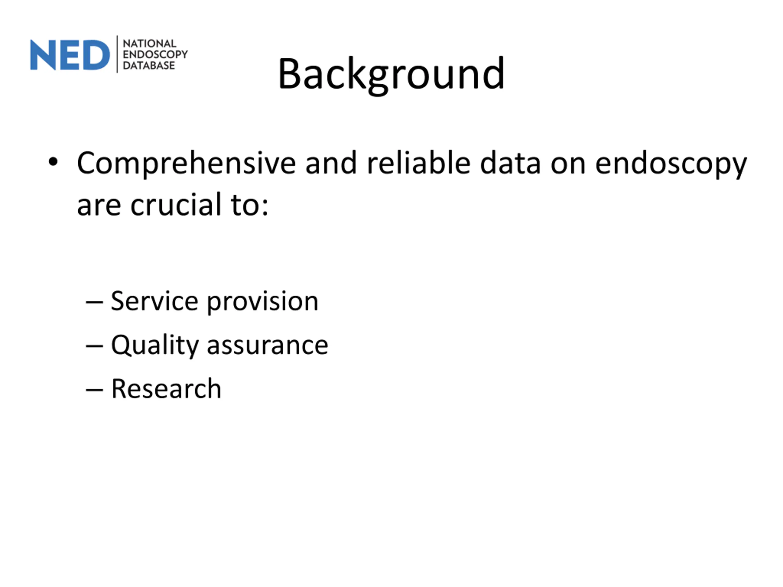 Background Comprehensive and reliable data on endoscopy are crucial to: Service provision Quality assurance Research