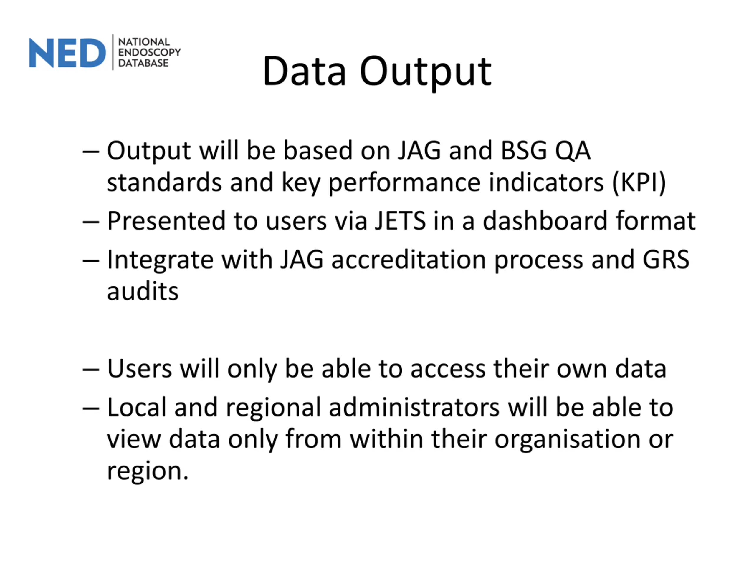 Data Output Output will be based on JAG and BSG QA standards and key performance indicators (KPI) Presented to users via JETS in a dashboard format Integrate with JAG accreditation process and GRS audits Users will only be able to access their own data Local and regional administrators will be able to view data only from within their organisation or region.