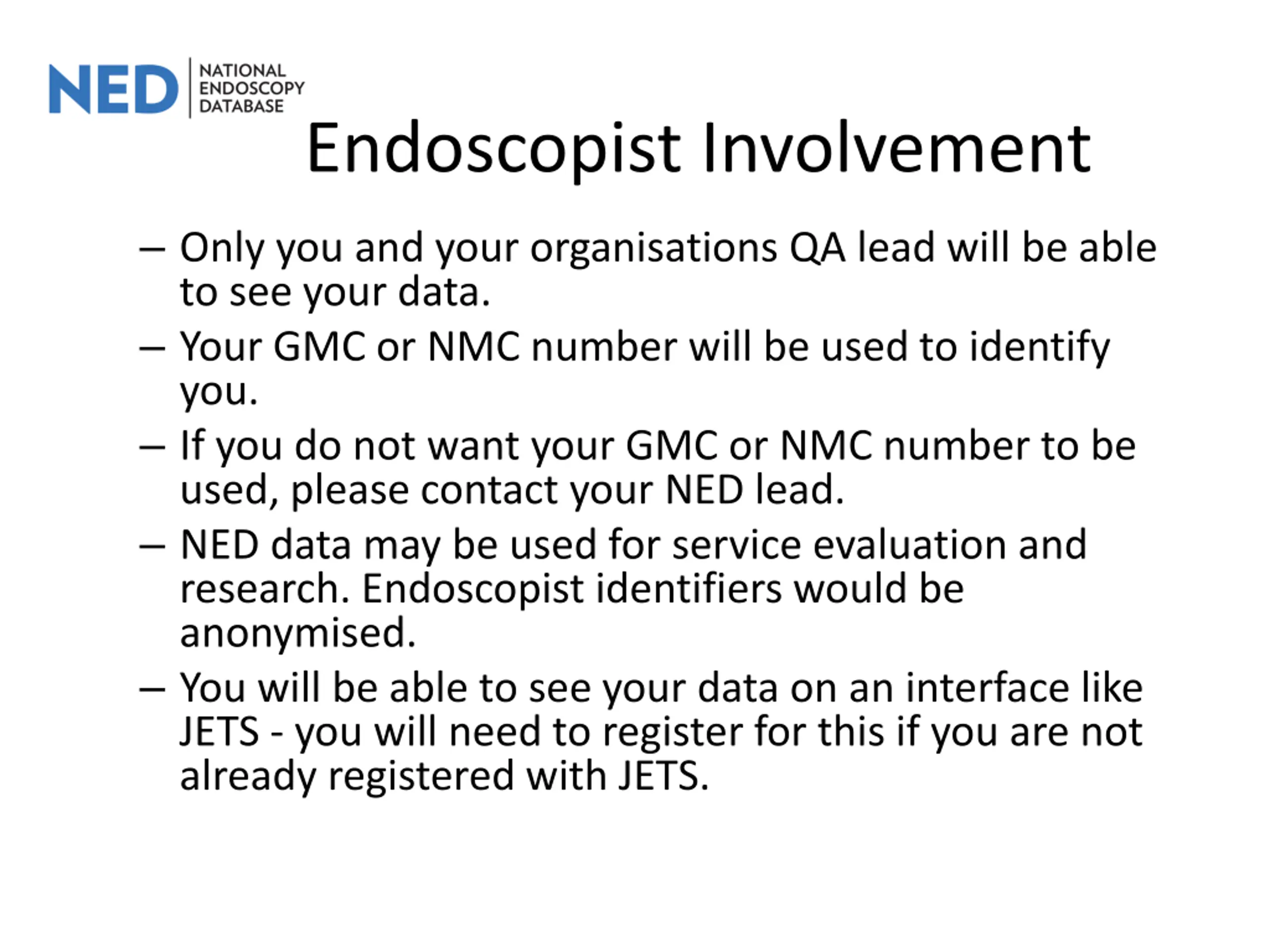 Endoscopist Involvement Only you and your organisations QA lead will be able to see your data. Your GMC or NMC number will be used to identify you. If you do not want your GMC or NMC number to be used, please contact your NED lead. NED data may be used for service evaluation and research. Endoscopist identifiers would be anonymised. You will be able to see your data on an interface like JETS - you will need to register for this if you are not already registered with JETS.