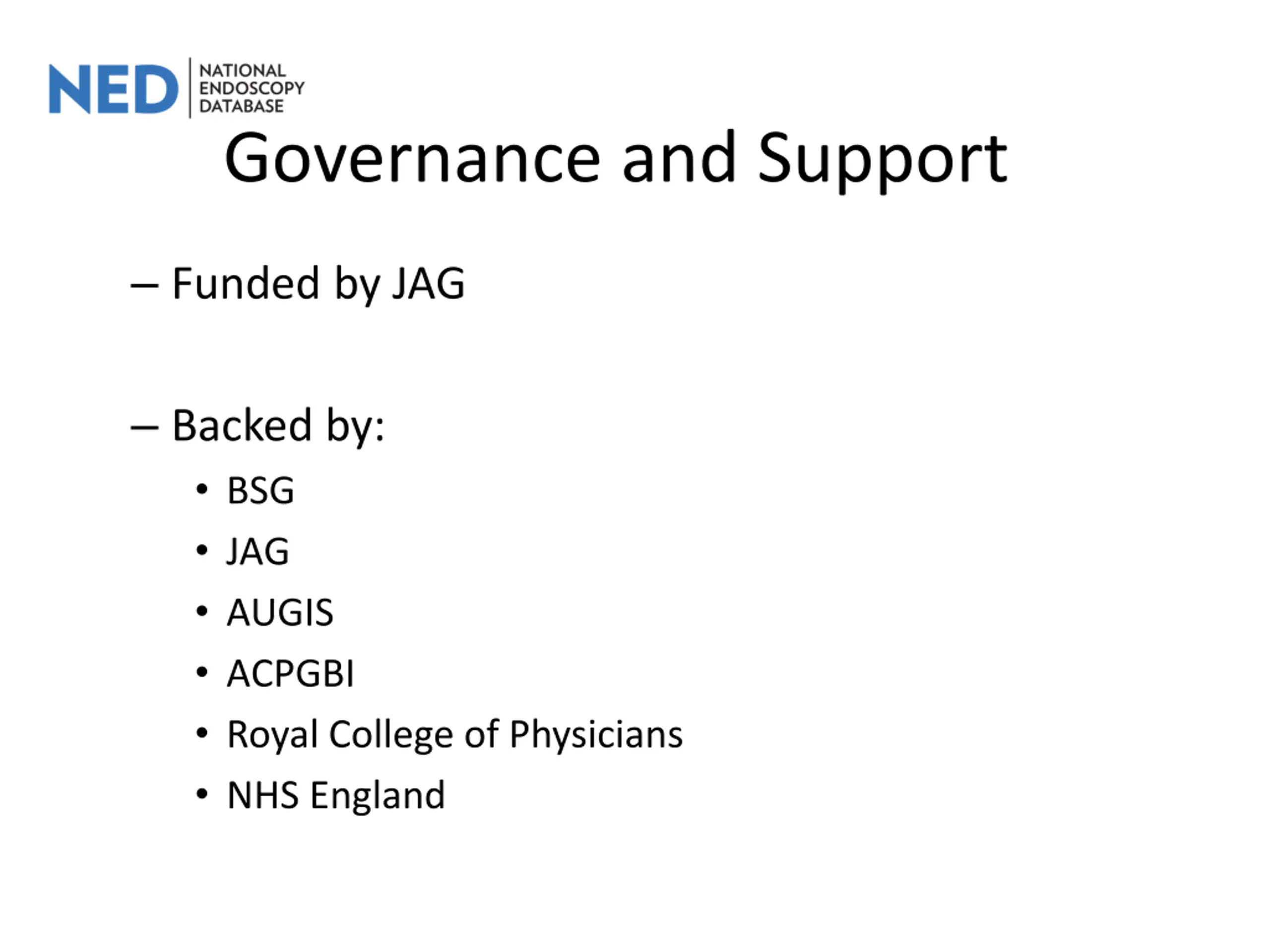 Governance and Support Funded by JAG Backed by: BSG JAG AUGIS ACPGBI Royal College of Physicians NHS England