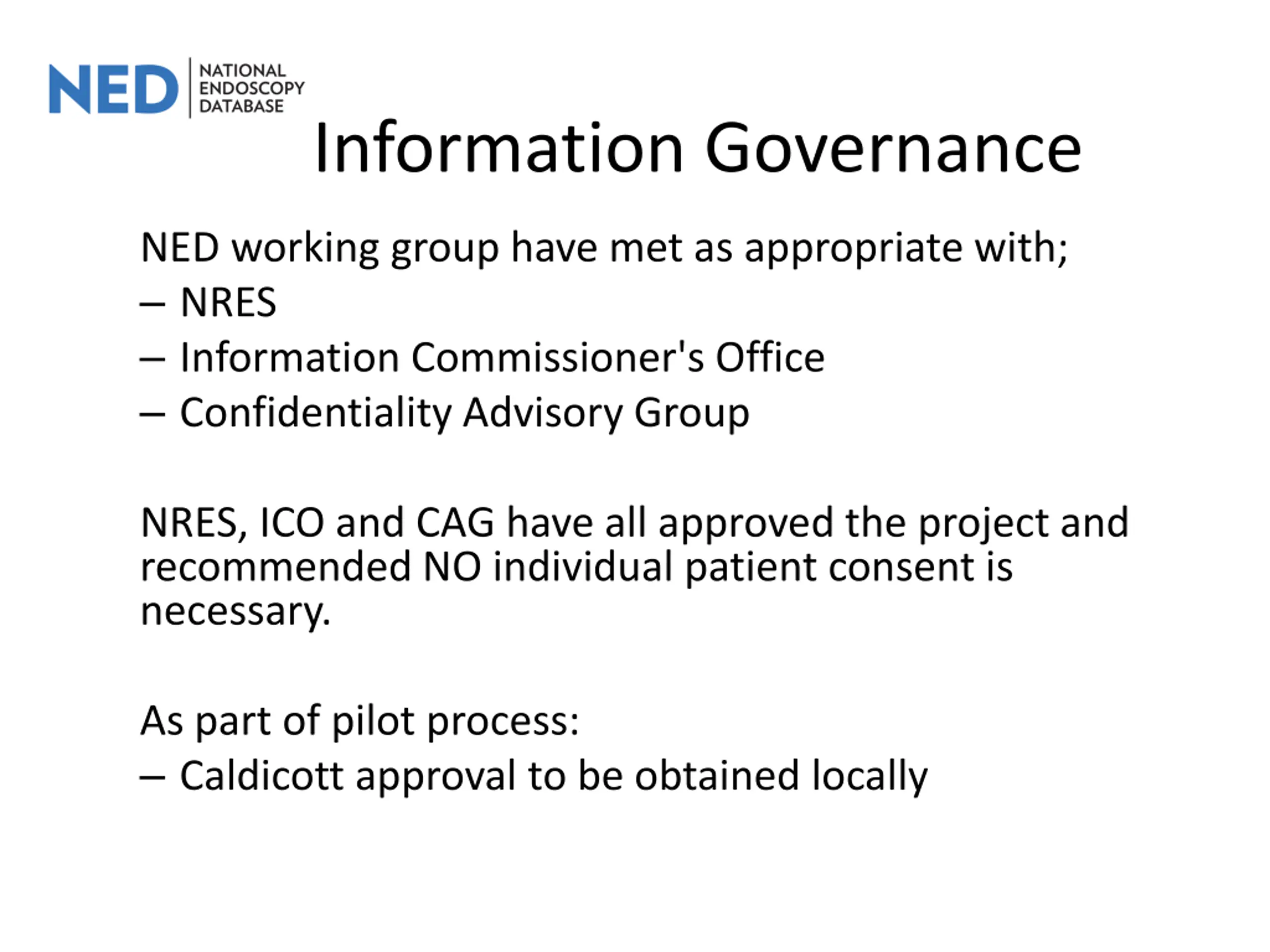 Information Governance NED working group have met as appropriate with; NRES Information Commissioner's Office Confidentiality Advisory Group NRES, ICO and CAG have all approved the project and recommended NO individual patient consent is necessary. As part of pilot process: Caldicott approval to be obtained locally