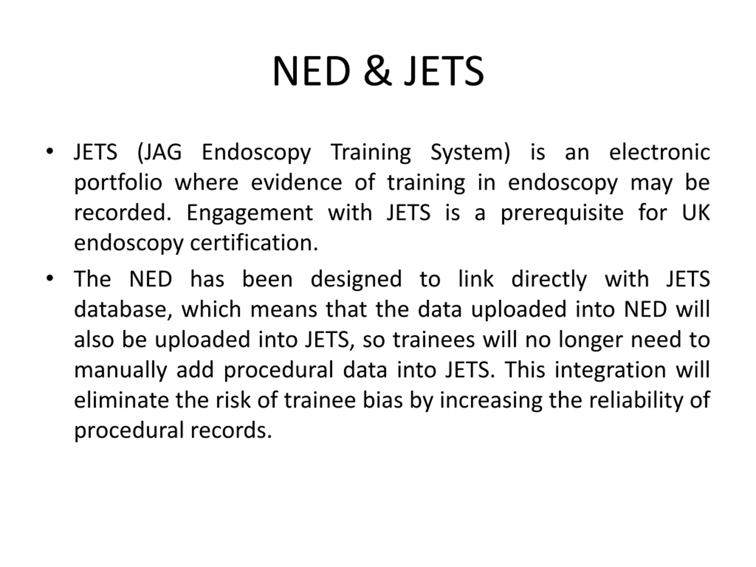 NED & JETS JETS (JAG Endoscopy Training System) is an electronic portfolio where evidence of training in endoscopy may be recorded. Engagement with JETS is a prerequisite for UK endoscopy certification. The NED has been designed to link directly with JETS database, which means that the data uploaded into NED will also be uploaded into JETS, so trainees will no longer need to manually add procedural data into JETS. This integration will eliminate the risk of trainee bias by increasing the reliability of procedural records.