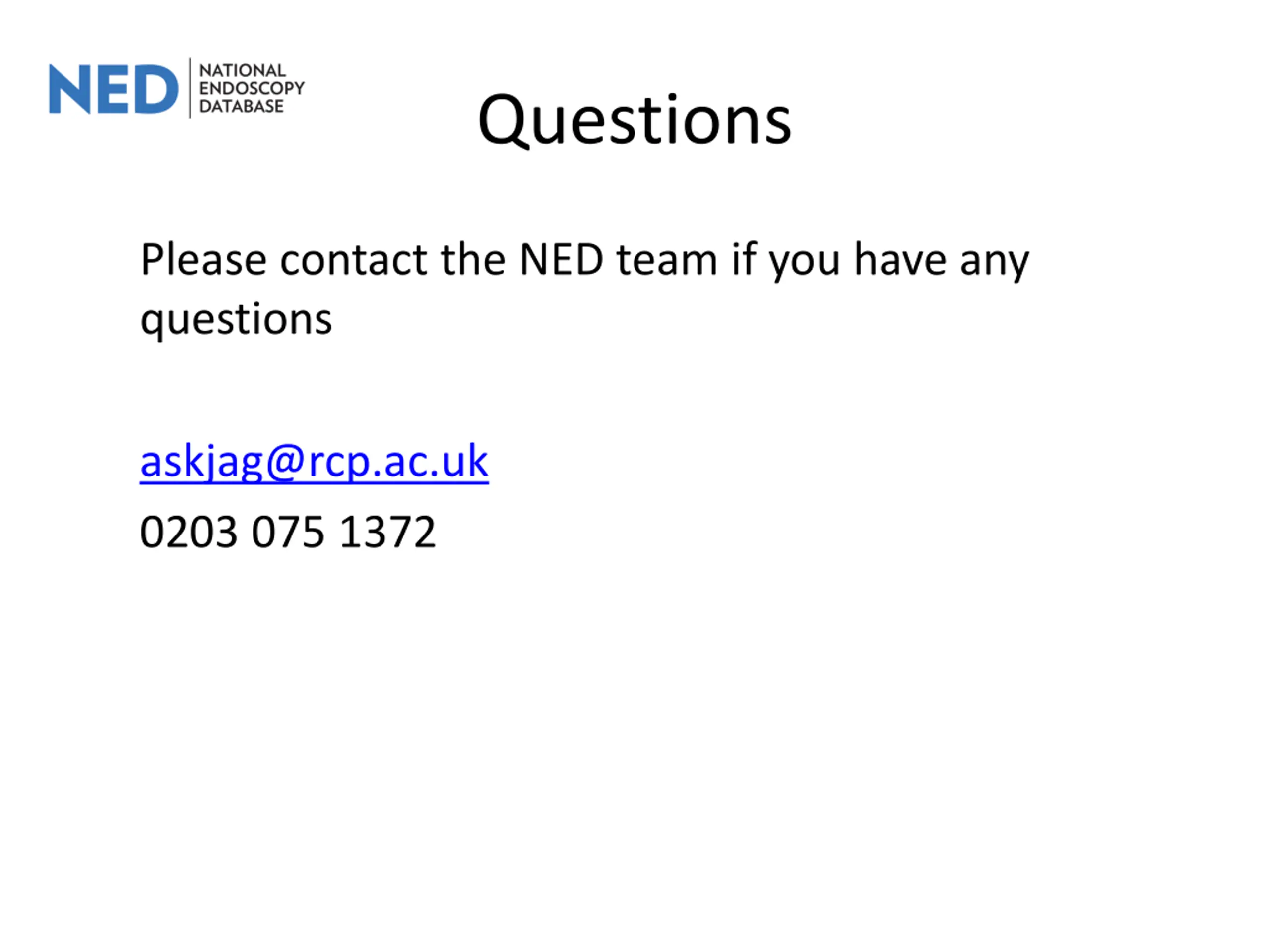 Questions Please contact the NED team if you have any questions askjag@rcp.ac.uk 0203 075 1372