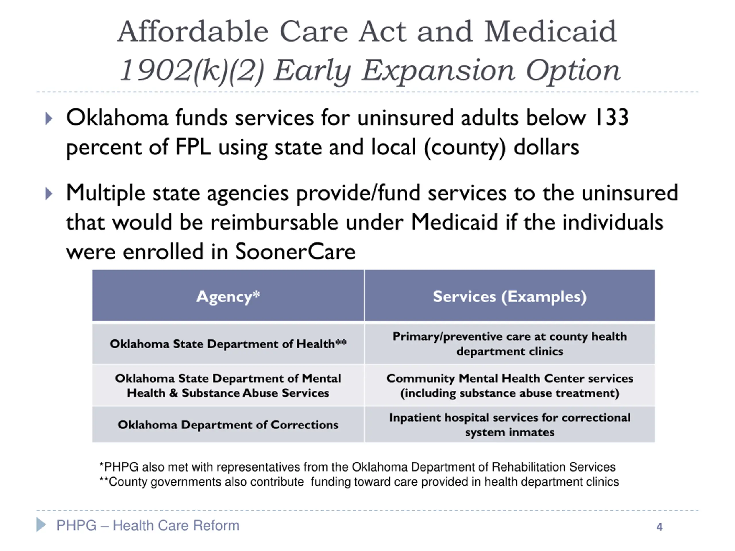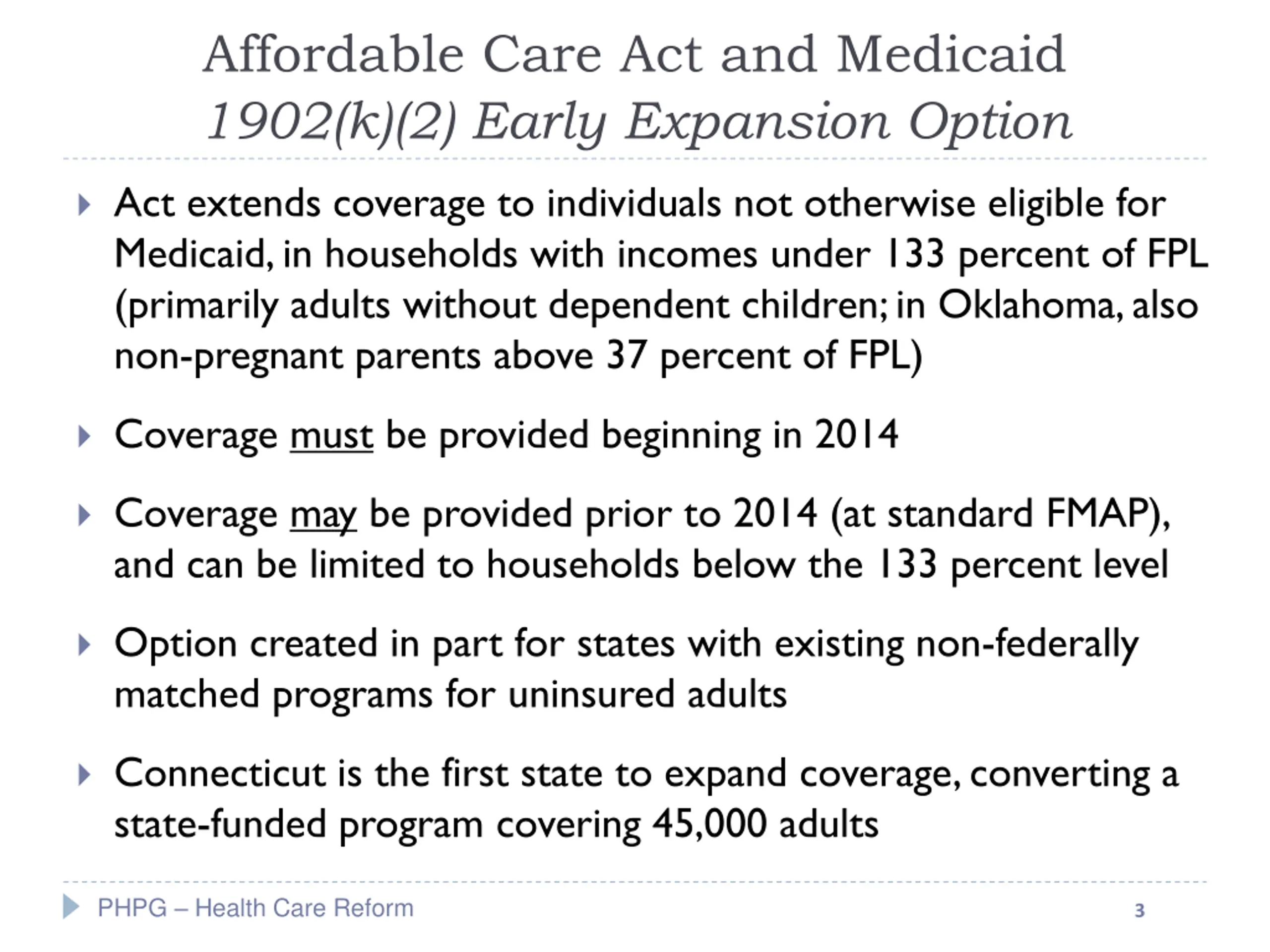 Affordable Care Act and Medicaid 1902(k)(2) Early Expansion Option Act extends coverage to individuals not otherwise eligible for Medicaid, in households with incomes under 133 percent of FPL (primarily adults without dependent children; in Oklahoma, also non-pregnant parents above 37 percent of FPL) Coverage must be provided beginning in 2014 Coverage may be provided prior to 2014 (at standard FMAP), and can be limited to households below the 133 percent level Option created in part for states with existing non-federally matched programs for uninsured adults Connecticut is the first state to expand coverage, converting a state-funded program covering 45,000 adults PHPG Health Care Reform 3
