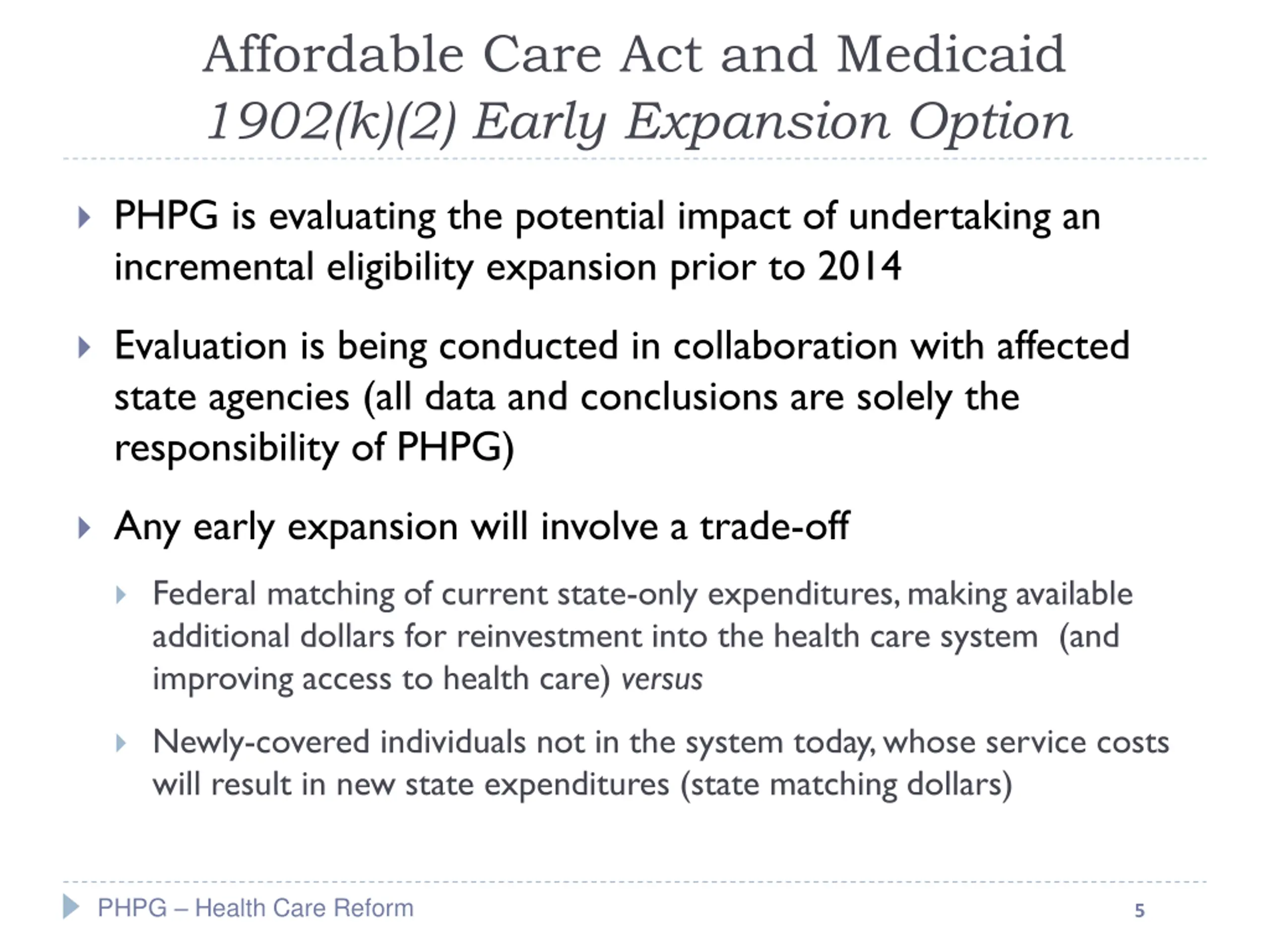 Affordable Care Act and Medicaid 1902(k)(2) Early Expansion Option Oklahoma funds services for uninsured adults below 133 percent of FPL using state and local (county) dollars Multiple state agencies provide/fund services to the uninsured that would be reimbursable under Medicaid if the individuals were enrolled in SoonerCare Agency* Services (Examples) Primary/preventive care at county health department clinics Oklahoma State Department of Health** Oklahoma State Department of Mental Health & Substance Abuse Services Community Mental Health Center services (including substance abuse treatment) Inpatient hospital services for correctional system inmates Oklahoma Department of Corrections *PHPG also met with representatives from the Oklahoma Department of Rehabilitation Services **County governments also contribute funding toward care provided in health department clinics PHPG Health Care Reform 4