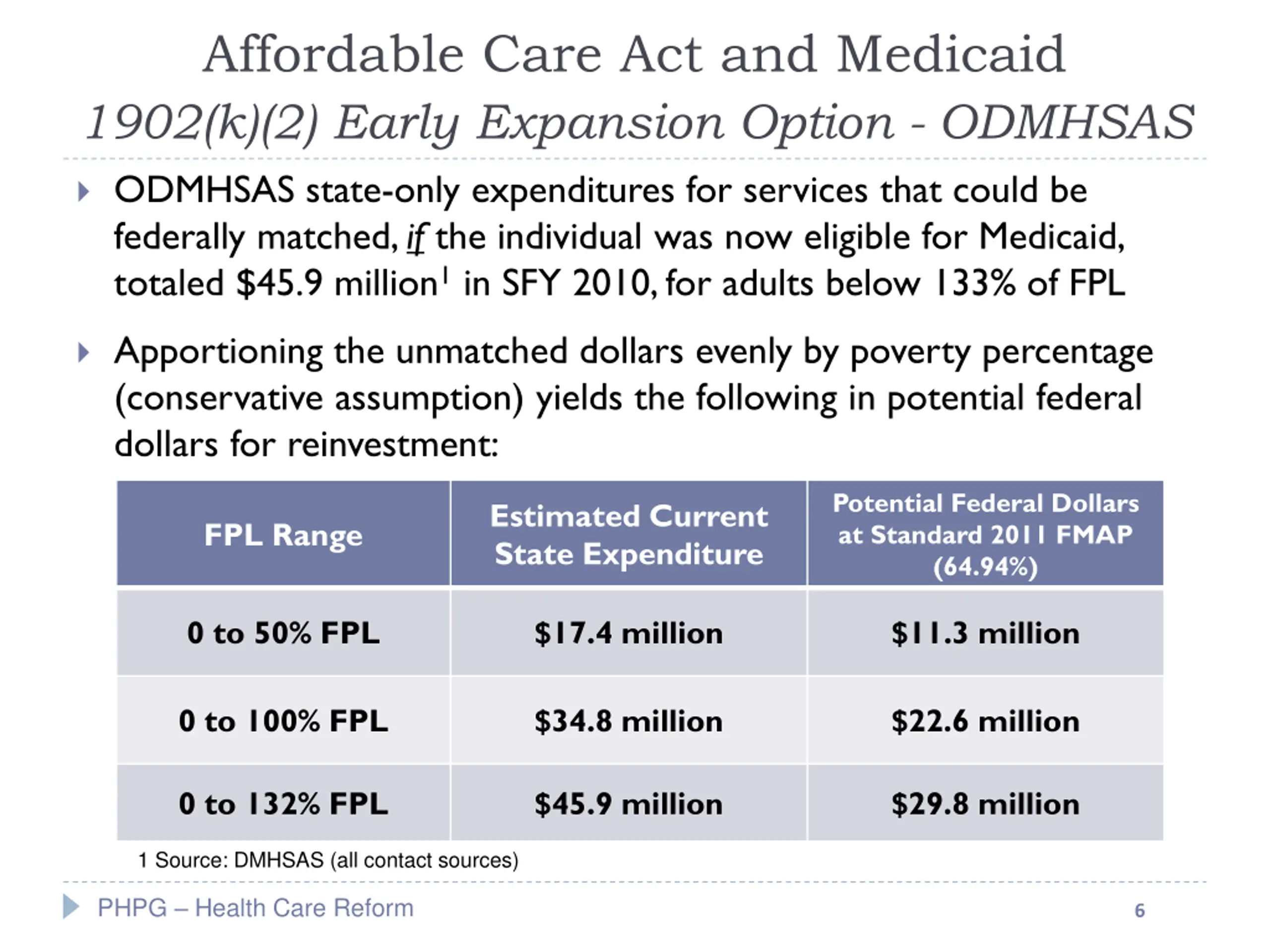 Affordable Care Act and Medicaid 1902(k)(2) Early Expansion Option - ODMHSAS ODMHSAS state-only expenditures for services that could be federally matched, if the individual was now eligible for Medicaid, totaled $45.9 million1 in SFY 2010, for adults below 133% of FPL Apportioning the unmatched dollars evenly by poverty percentage (conservative assumption) yields the following in potential federal dollars for reinvestment: Potential Federal Dollars at Standard 2011 FMAP (64.94%) Estimated Current State Expenditure FPL Range 0 to 50% FPL $17.4 million $11.3 million 0 to 100% FPL $34.8 million $22.6 million 0 to 132% FPL $45.9 million $29.8 million 1 Source: DMHSAS (all contact sources) PHPG Health Care Reform 6