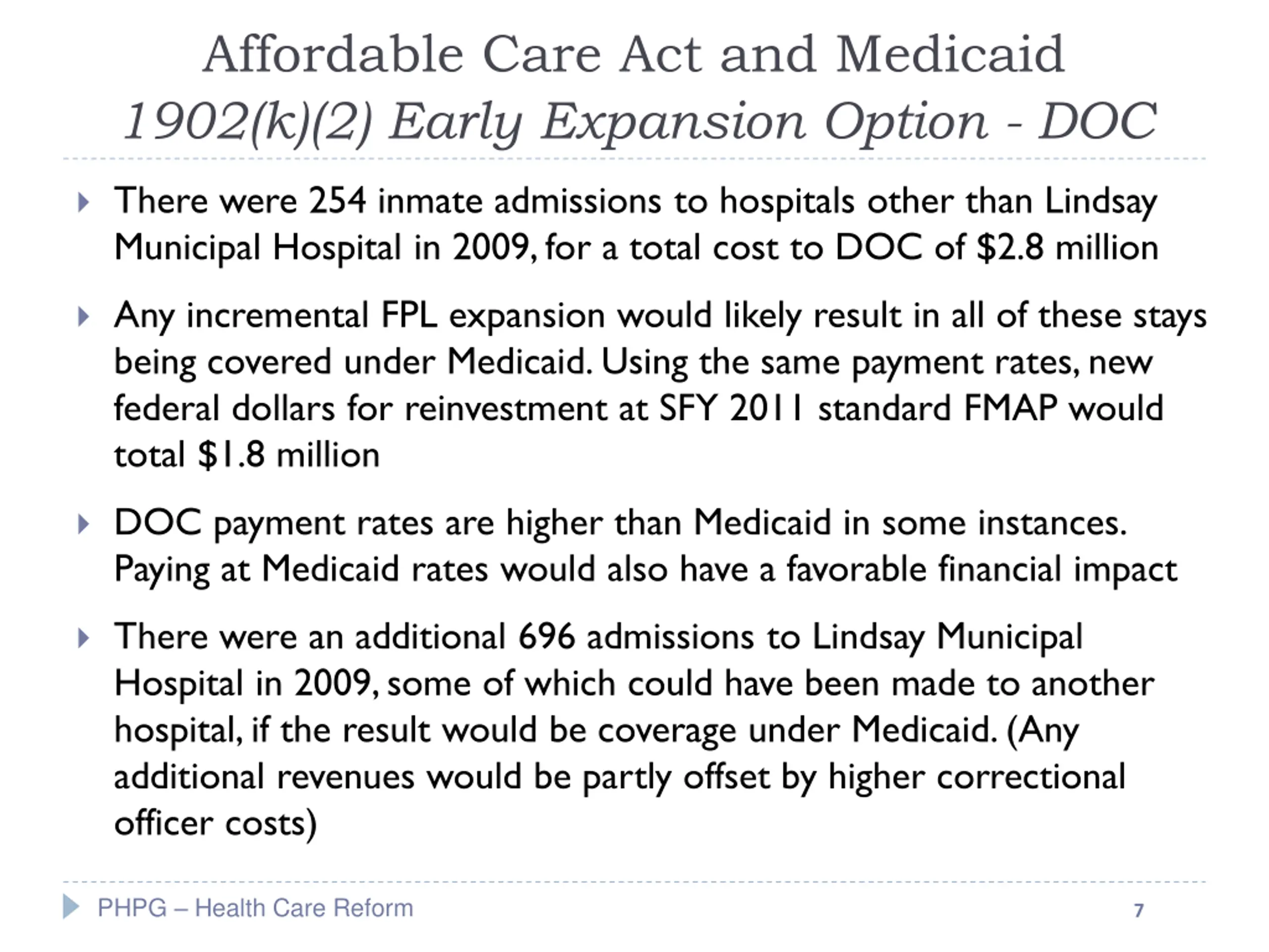 Affordable Care Act and Medicaid 1902(k)(2) Early Expansion Option - DOC There were 254 inmate admissions to hospitals other than Lindsay Municipal Hospital in 2009, for a total cost to DOC of $2.8 million Any incremental FPL expansion would likely result in all of these stays being covered under Medicaid. Using the same payment rates, new federal dollars for reinvestment at SFY 2011 standard FMAP would total $1.8 million DOC payment rates are higher than Medicaid in some instances. Paying at Medicaid rates would also have a favorable financial impact There were an additional 696 admissions to Lindsay Municipal Hospital in 2009, some of which could have been made to another hospital, if the result would be coverage under Medicaid. (Any additional revenues would be partly offset by higher correctional officer costs) PHPG Health Care Reform 7