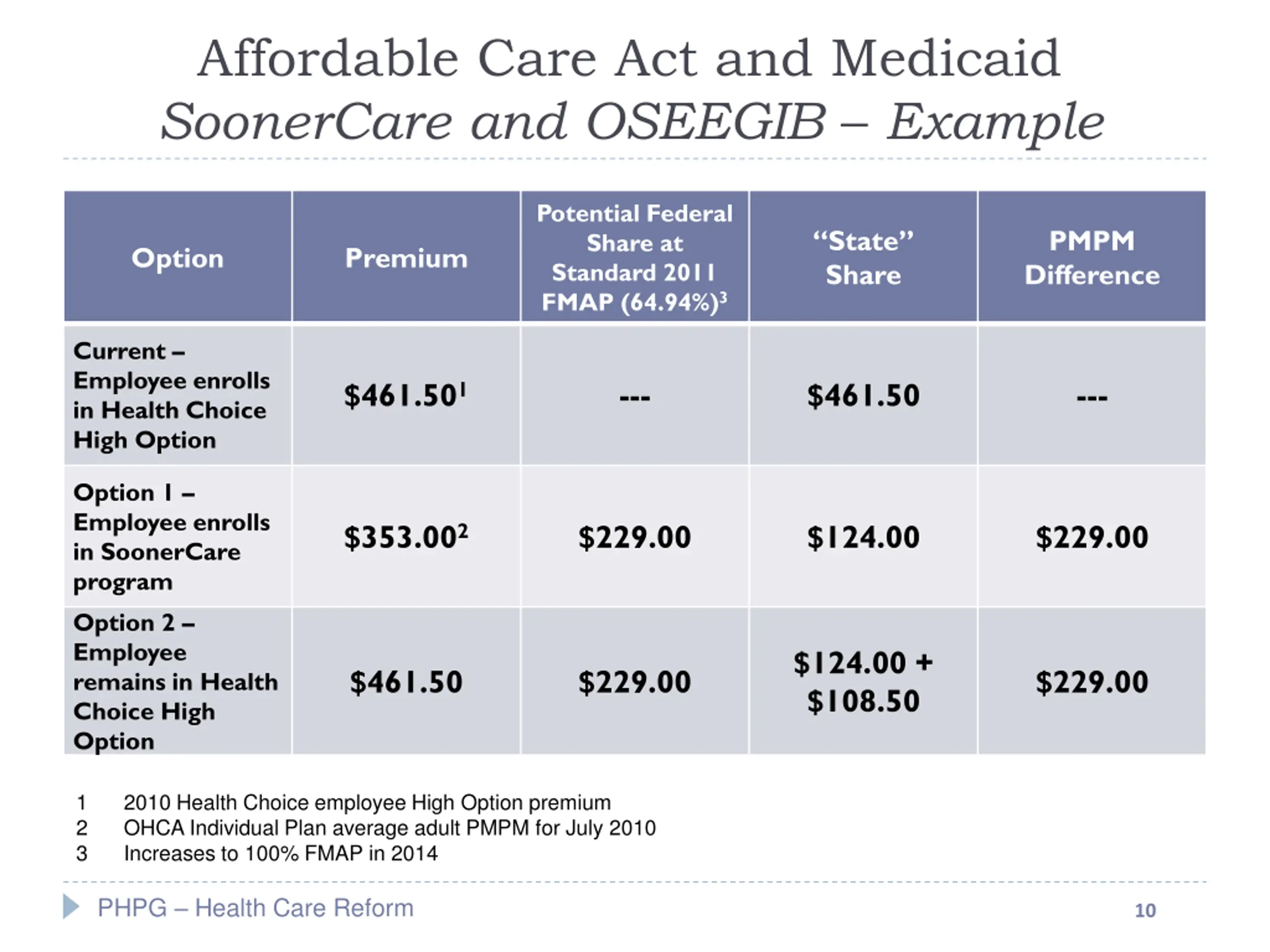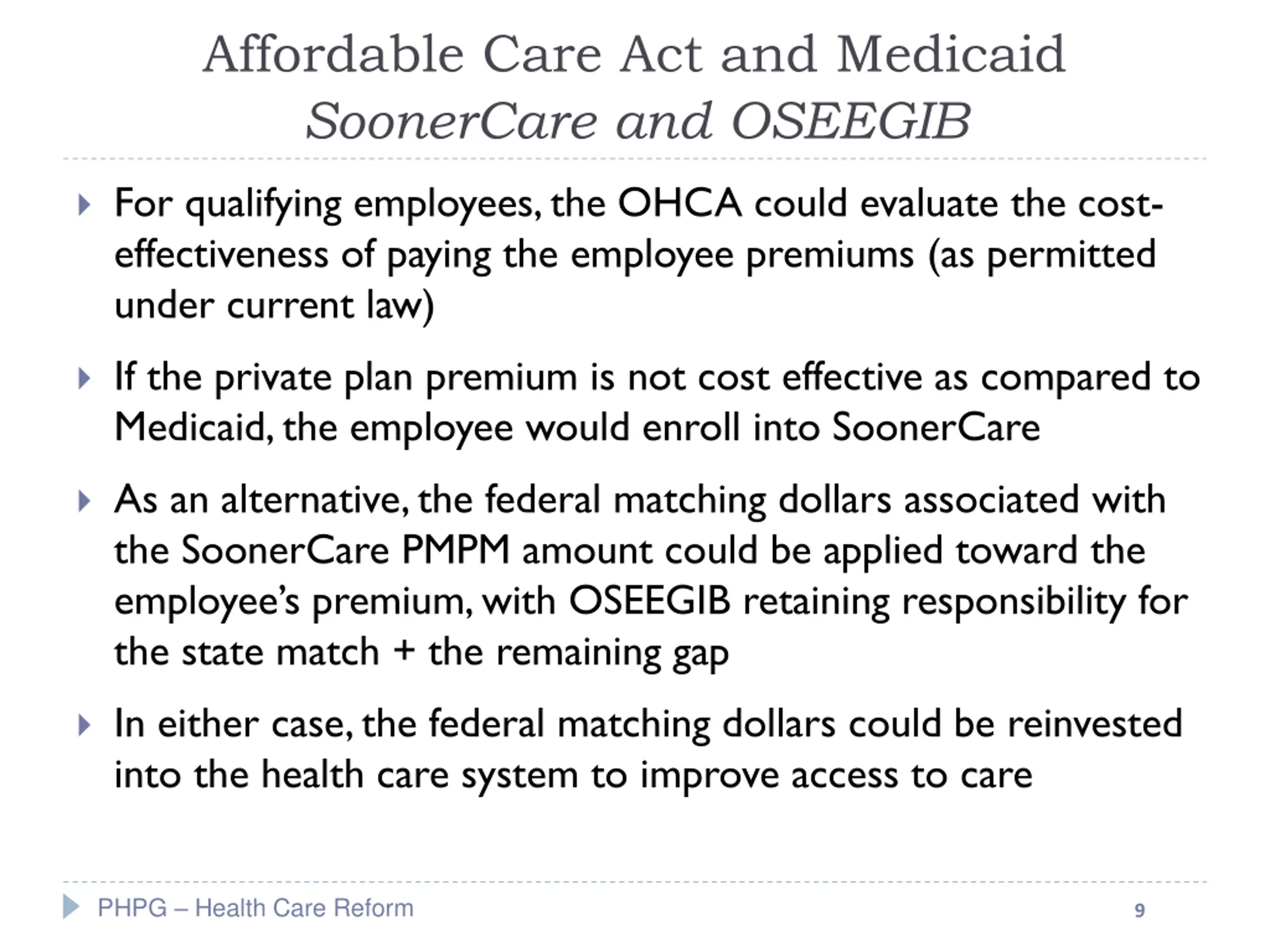 Affordable Care Act and Medicaid SoonerCare and OSEEGIB For qualifying employees, the OHCA could evaluate the cost- effectiveness of paying the employee premiums (as permitted under current law) If the private plan premium is not cost effective as compared to Medicaid, the employee would enroll into SoonerCare As an alternative, the federal matching dollars associated with the SoonerCare PMPM amount could be applied toward the employee s premium, with OSEEGIB retaining responsibility for the state match + the remaining gap In either case, the federal matching dollars could be reinvested into the health care system to improve access to care PHPG Health Care Reform 9