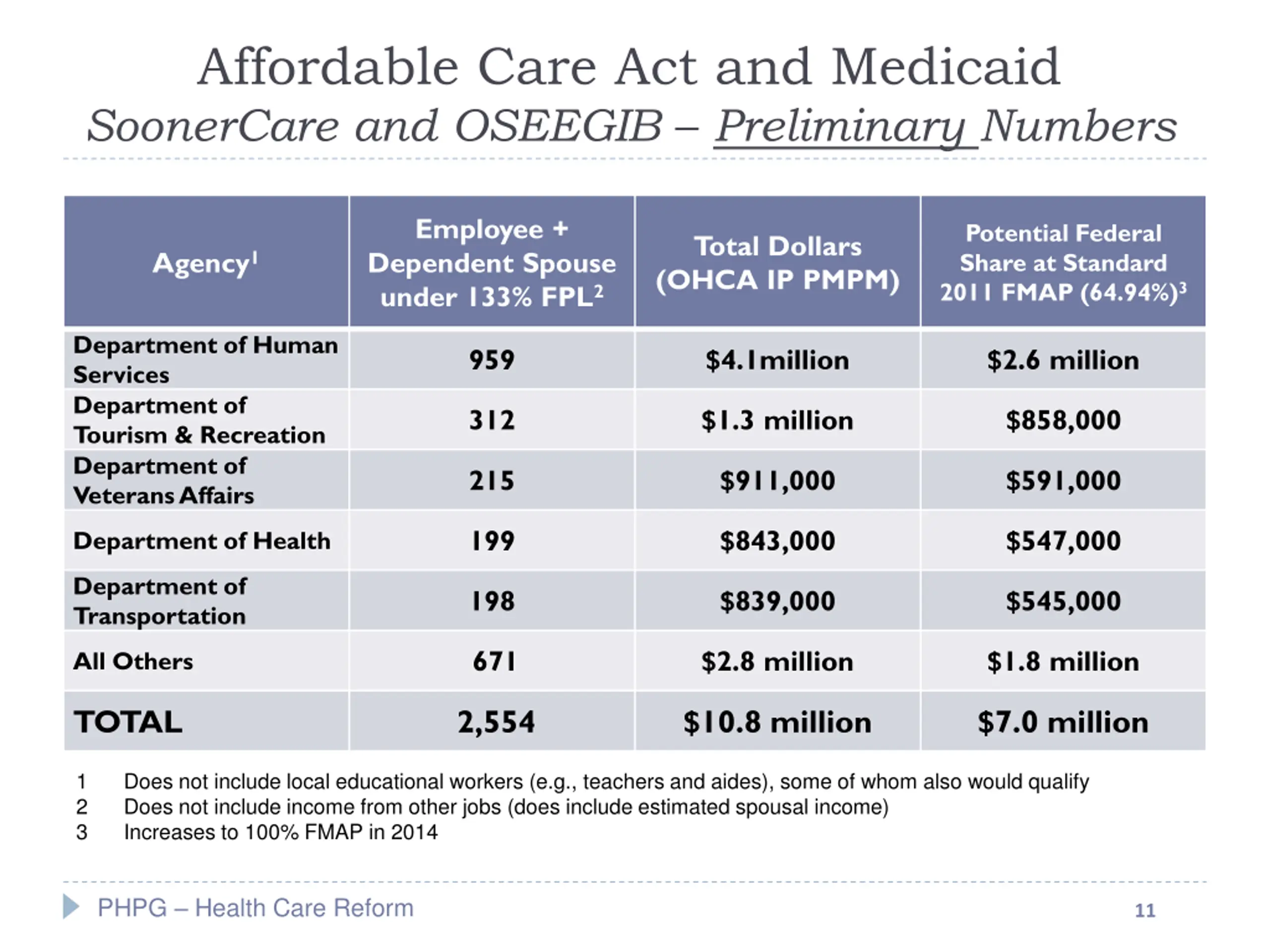Affordable Care Act and Medicaid SoonerCare and OSEEGIB Example Potential Federal Share at Standard 2011 FMAP (64.94%)3 State Share PMPM Difference Option Premium Current Employee enrolls in Health Choice High Option $461.501 --- $461.50 --- Option 1 Employee enrolls in SoonerCare program $353.002 $229.00 $124.00 $229.00 Option 2 Employee remains in Health Choice High Option $124.00 + $108.50 $461.50 $229.00 $229.00 1 2 3 2010 Health Choice employee High Option premium OHCA Individual Plan average adult PMPM for July 2010 Increases to 100% FMAP in 2014 PHPG Health Care Reform 10