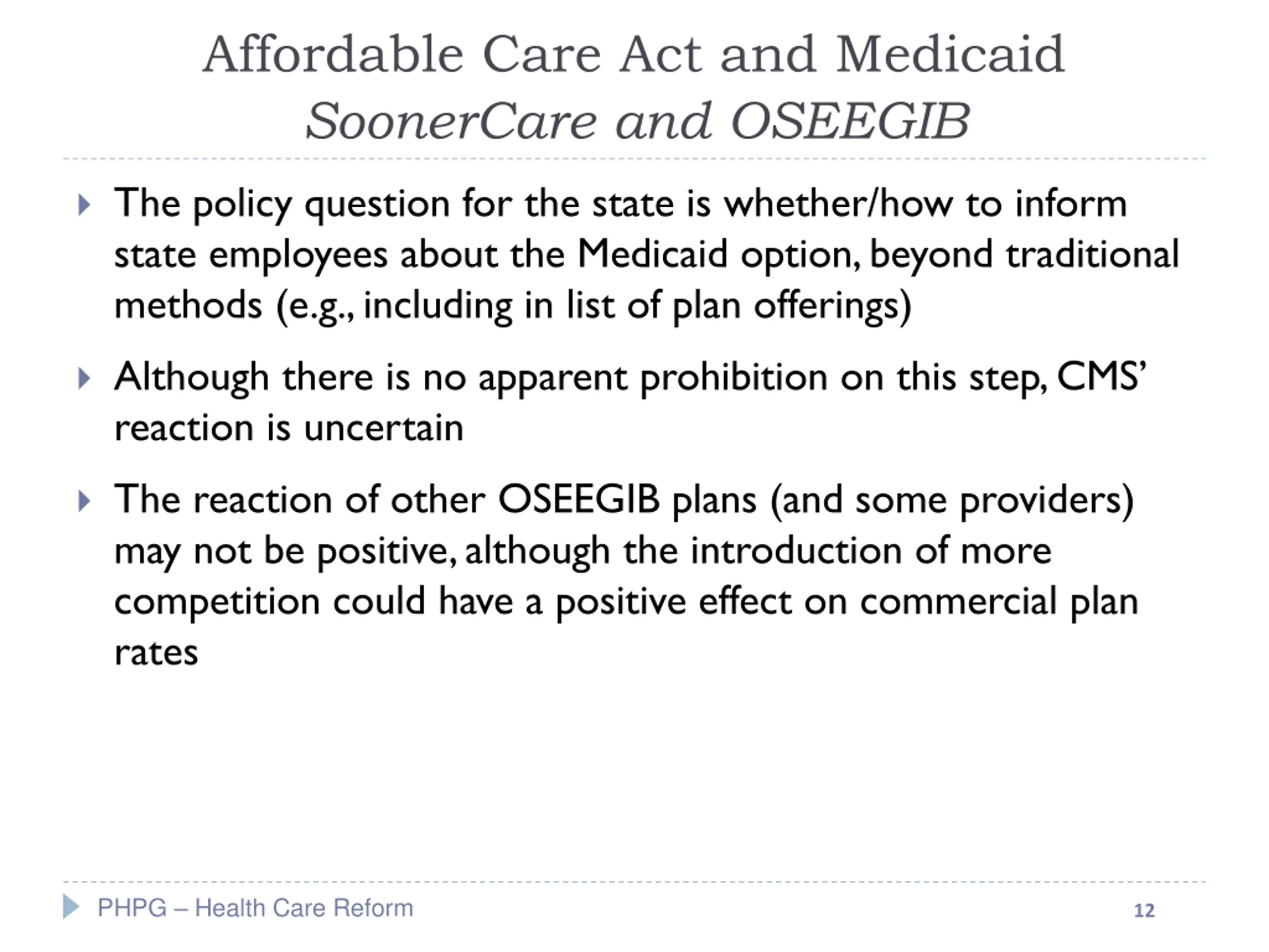 Affordable Care Act and Medicaid SoonerCare and OSEEGIB The policy question for the state is whether/how to inform state employees about the Medicaid option, beyond traditional methods (e.g., including in list of plan offerings) Although there is no apparent prohibition on this step, CMS reaction is uncertain The reaction of other OSEEGIB plans (and some providers) may not be positive, although the introduction of more competition could have a positive effect on commercial plan rates PHPG Health Care Reform 12