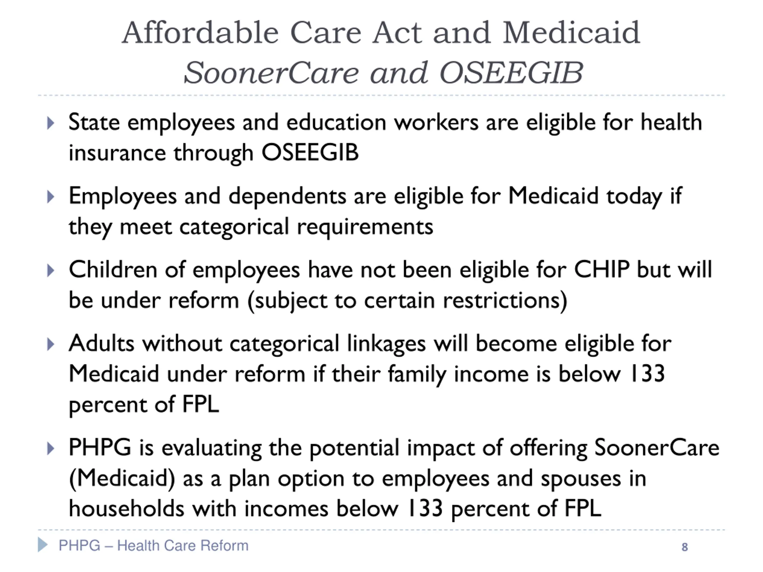 Affordable Care Act and Medicaid Discussion Topics Undertaking an incremental Medicaid expansion in advance of 2014 Affordable Care Act mandate Offering SoonerCare as an option through OSEEGIB to qualifying low income households PHPG Health Care Reform 2