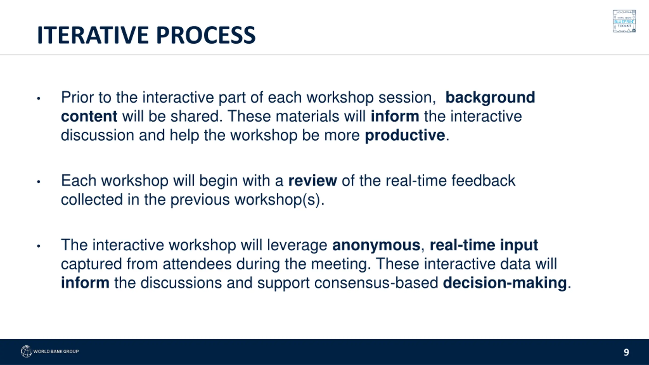 ITERATIVE PROCESS Prior to the interactive part of each workshop session, background content will be shared. These materials will inform the interactive discussion and help the workshop be more productive. Each workshop will begin with a review of the real-time feedback collected in the previous workshop(s). The interactive workshop will leverage anonymous, real-time input captured from attendees during the meeting. These interactive data will inform the discussions and support consensus-based decision-making. 9