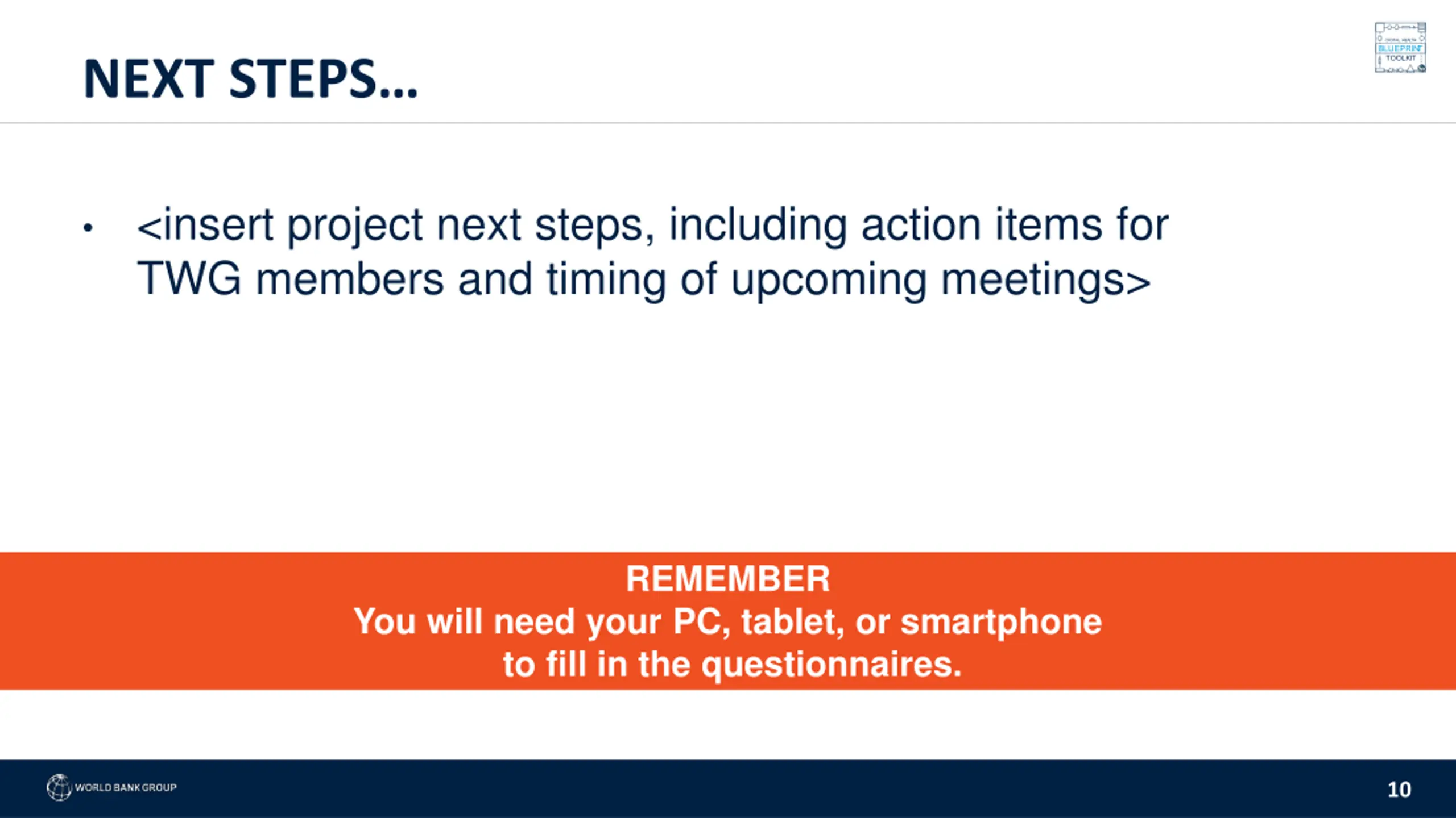 NEXT STEPS <insert project next steps, including action items for TWG members and timing of upcoming meetings> REMEMBER You will need your PC, tablet, or smartphone to fill in the questionnaires. 10