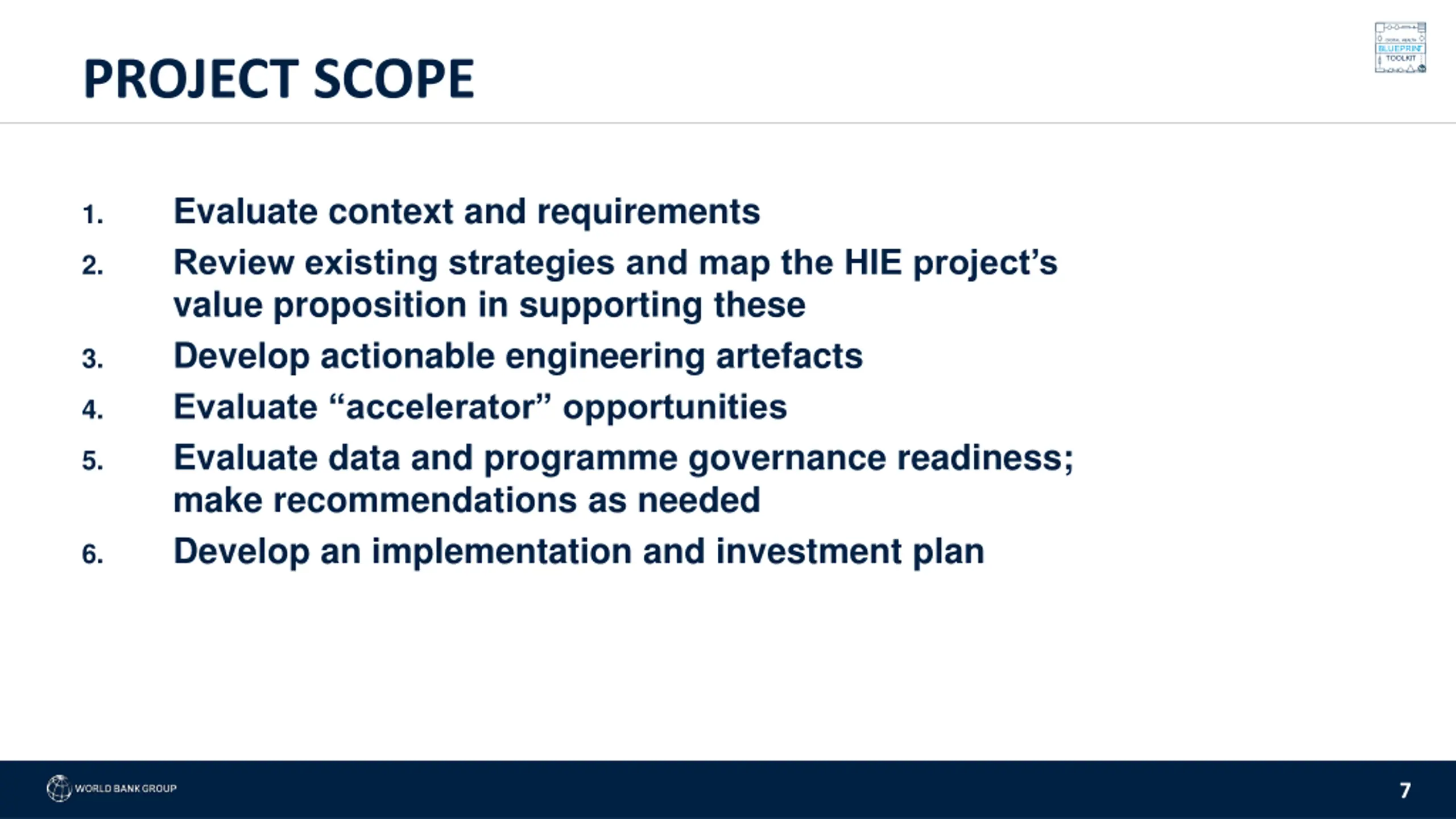 PROJECT SCOPE Evaluate context and requirements Review existing strategies and map the HIE project s value proposition in supporting these Develop actionable engineering artefacts Evaluate accelerator opportunities Evaluate data and programme governance readiness; make recommendations as needed Develop an implementation and investment plan 1. 2. 3. 4. 5. 6. 7