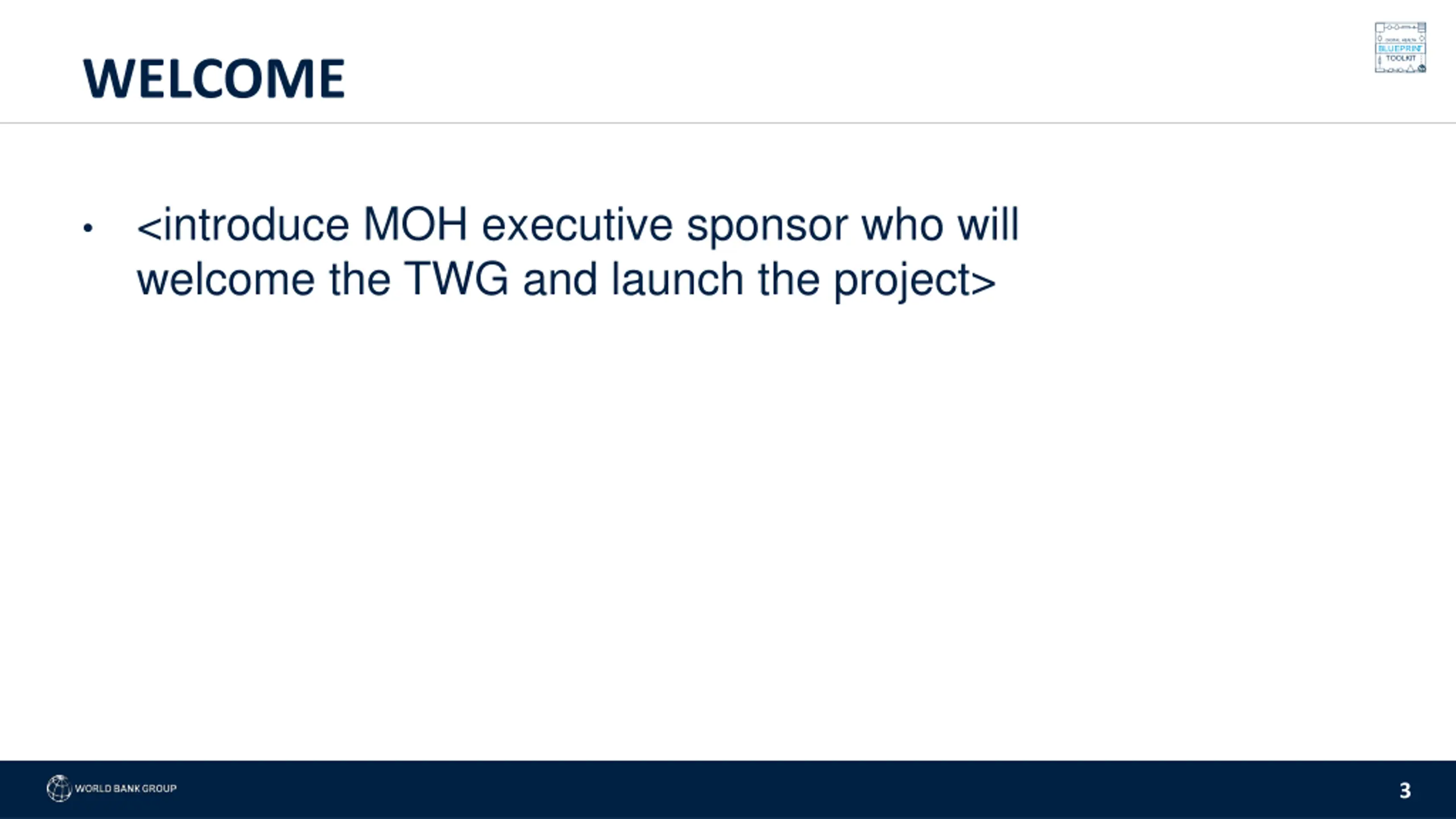 WELCOME <introduce MOH executive sponsor who will welcome the TWG and launch the project> 3