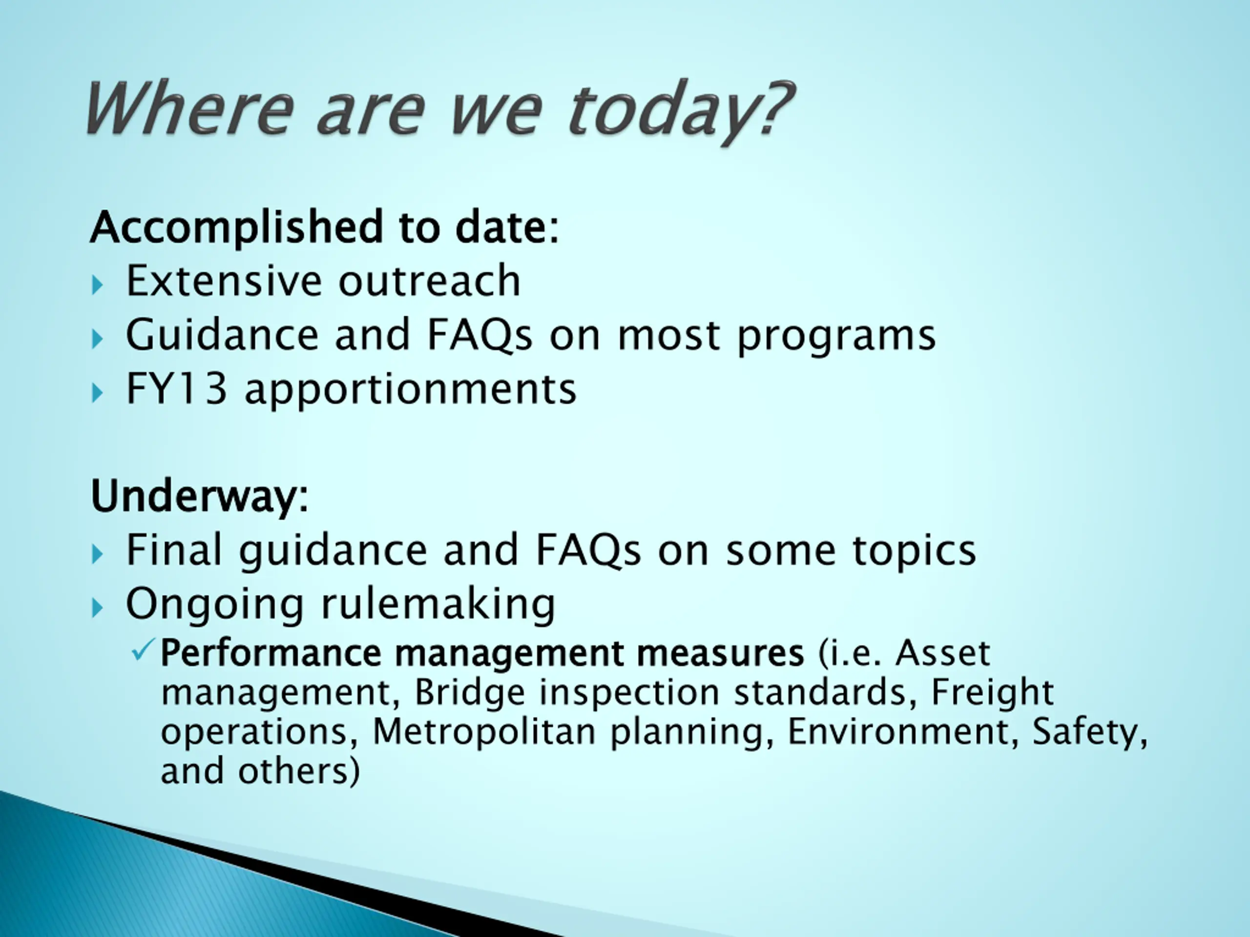 Accomplished to date: Extensive outreach Guidance and FAQs on most programs FY13 apportionments Accomplished to date: Underway: Final guidance and FAQs on some topics Ongoing rulemaking Performance management measures management, Bridge inspection standards, Freight operations, Metropolitan planning, Environment, Safety, and others) Underway: Performance management measures (i.e. Asset