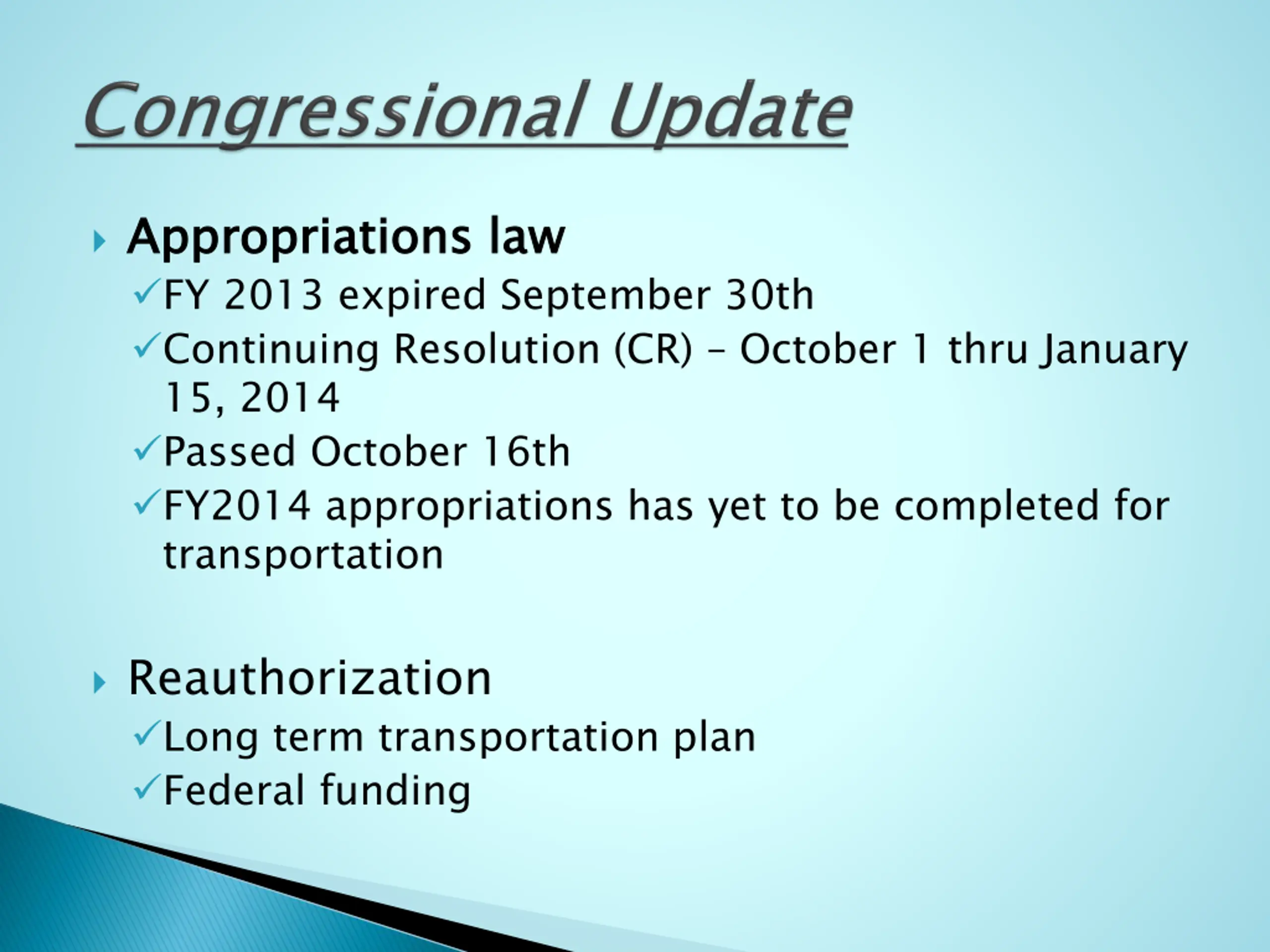 Appropriations law FY 2013 expired September 30th Continuing Resolution (CR) October 1 thru January 15, 2014 Passed October 16th FY2014 appropriations has yet to be completed for transportation Appropriations law Reauthorization Long term transportation plan Federal funding