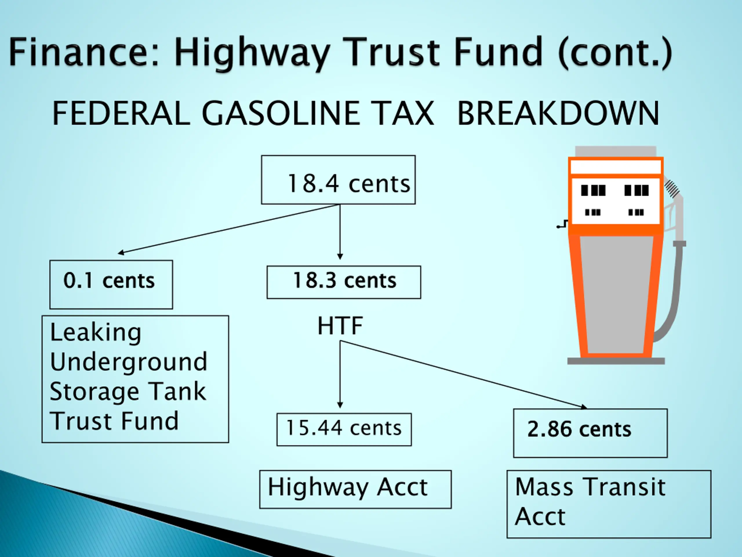 FEDERAL GASOLINE TAX BREAKDOWN 18.4 cents 18.3 cents HTF 18.3 cents 0.1 0.1 cents cents Leaking Underground Storage Tank Trust Fund 15.44 cents 2.86 cents 2.86 cents Highway Acct Mass Transit Acct