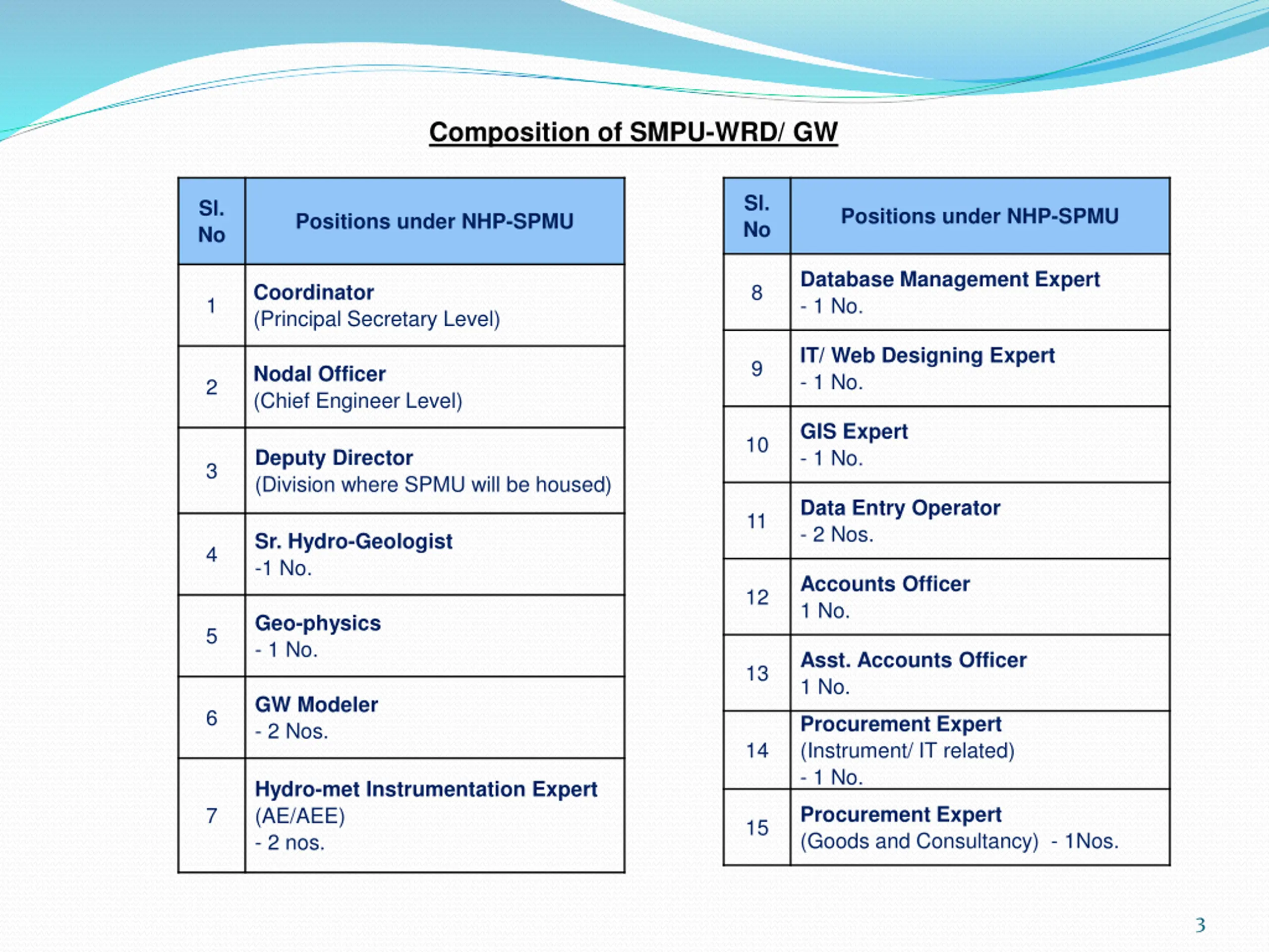 Details of SPMU, Staff strength Composition of SMPU-WRD/ SW Sl. No Req. Number Actual Number Sl. No Req. Number Actual Number Positions under NHP-SPMU Positions under NHP-SPMU Coordinator (Principal Secretary Level) Database Management Expert - 1 No. 1 1 1 8 1 1 IT/ Web Designing Expert - 1 No. Nodal Officer (Chief Engineer Level) 9 1 2 1 1 Superintending Officer (Division where SPMU will be housed) Sr. Water Management Expert (EE Level or higher) 1 No. Hydrologist (AEE Level for higher) 1 No. 10 GIS Expert - 1 No. 1 3 1 1 11 Data Entry Operator - 2 Nos. 2 4 1 1 Accounts Officer - 1 No. 12 1 Asst. Accounts Officer - 1 No. Procurement Expert (Instrument/ IT related) - 1 No. Procurement Expert (Goods and Consultancy) - 1 No. 5 1 1 13 1 Modeler (AE/AEE) 2 Nos. 6 2 4 14 2 Hydro-met Instrumentation Expert (AE/AEE) - 2 Nos. 7 2 2 15 2 2