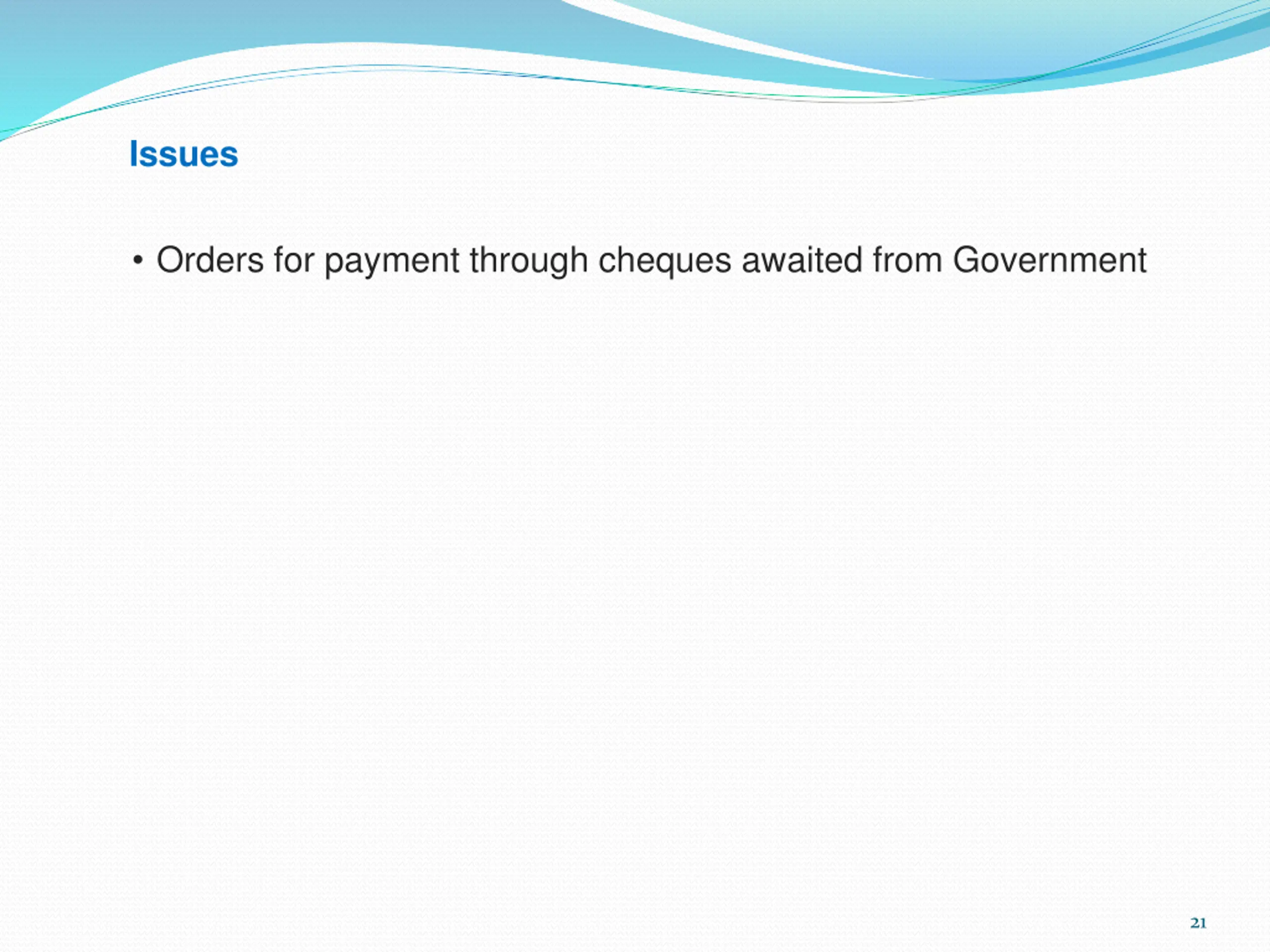 Funds received 2016-17 & 2017-18 and expenditure details MoWR have released two tranches of funds as on 11-08-2017 2016-17 January 2017 1 Crore 2017-18 July 2017 4 Crores Total 5 Crores Expenditure so far NIL (Orders for payment through cheques awaited from Government) 4
