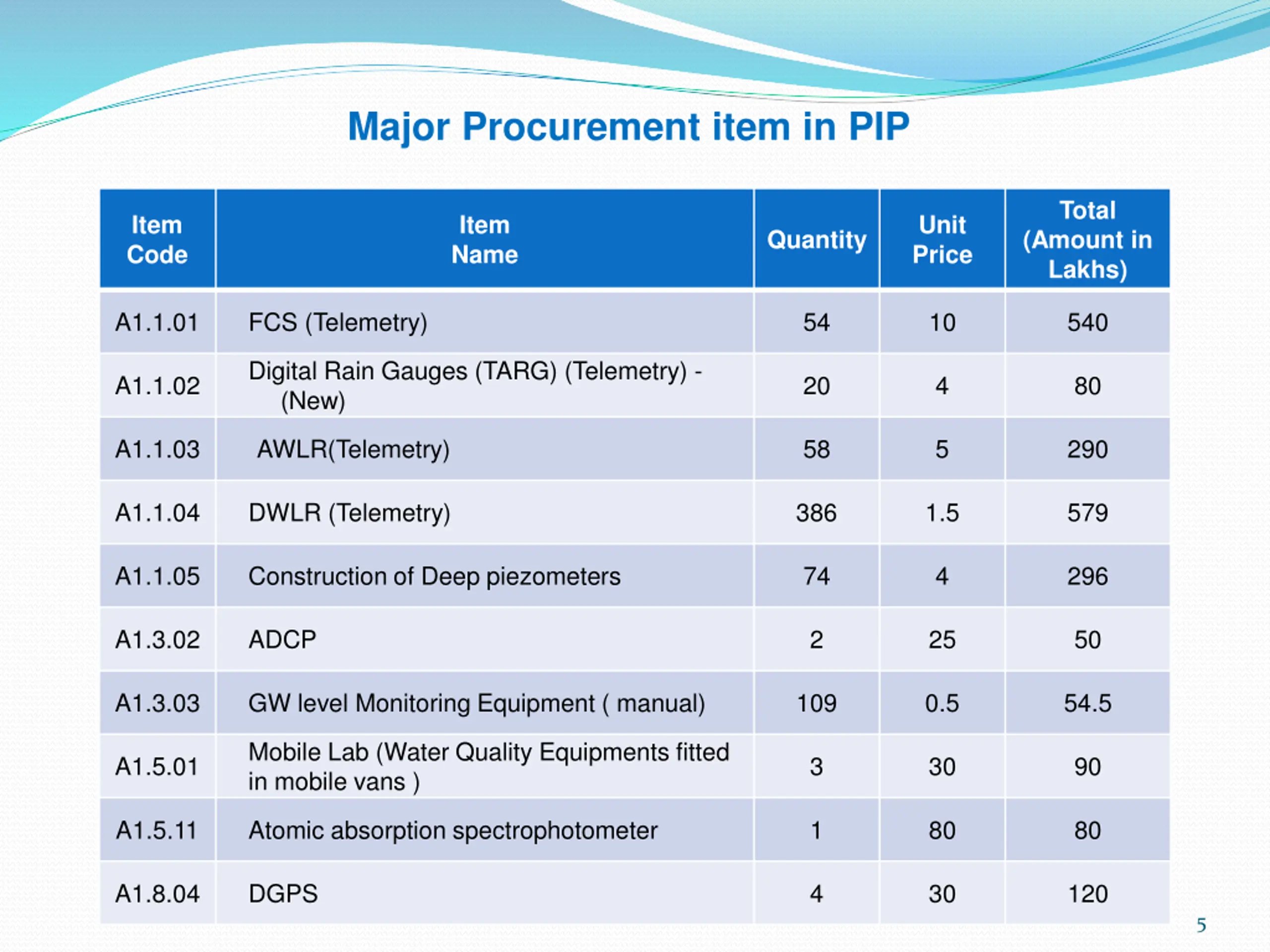 Major Procurement item in PIP Total Item Code Item Name Quanti ty Unit Price (Amount in Lakhs) A1.1.06 DWLR (Telemetry) with water quality probe 20 3 60 A1.3.01 Flow Tracker Hand held 8 6 48 A1.8.06 Total station (4 Nos.) 3 / circle, 1 for CE office 4 9 36 A1.8.07 Electric logger vehicle mounted 3 25 75 Geophysical Equipment(Digital with field computer) (Resistivity meter) A1.8.09 26 3.5 91 Topographic survey for tanks, anicuts, minor irrigation, reservoirs etc for creation of basin information system A1.8.10 1000 A2.1.01 Construction of training center in Chennai 1 150 150 A2.4.09 Video conferencing equipment 1 25 25 A2.4.17 Workstations for modeling 13 5 65 State WRIs chapter including linkages with India- WRIS & Up gradation of TNWRIS including hardware, software etc., B1.1.01 200 6
