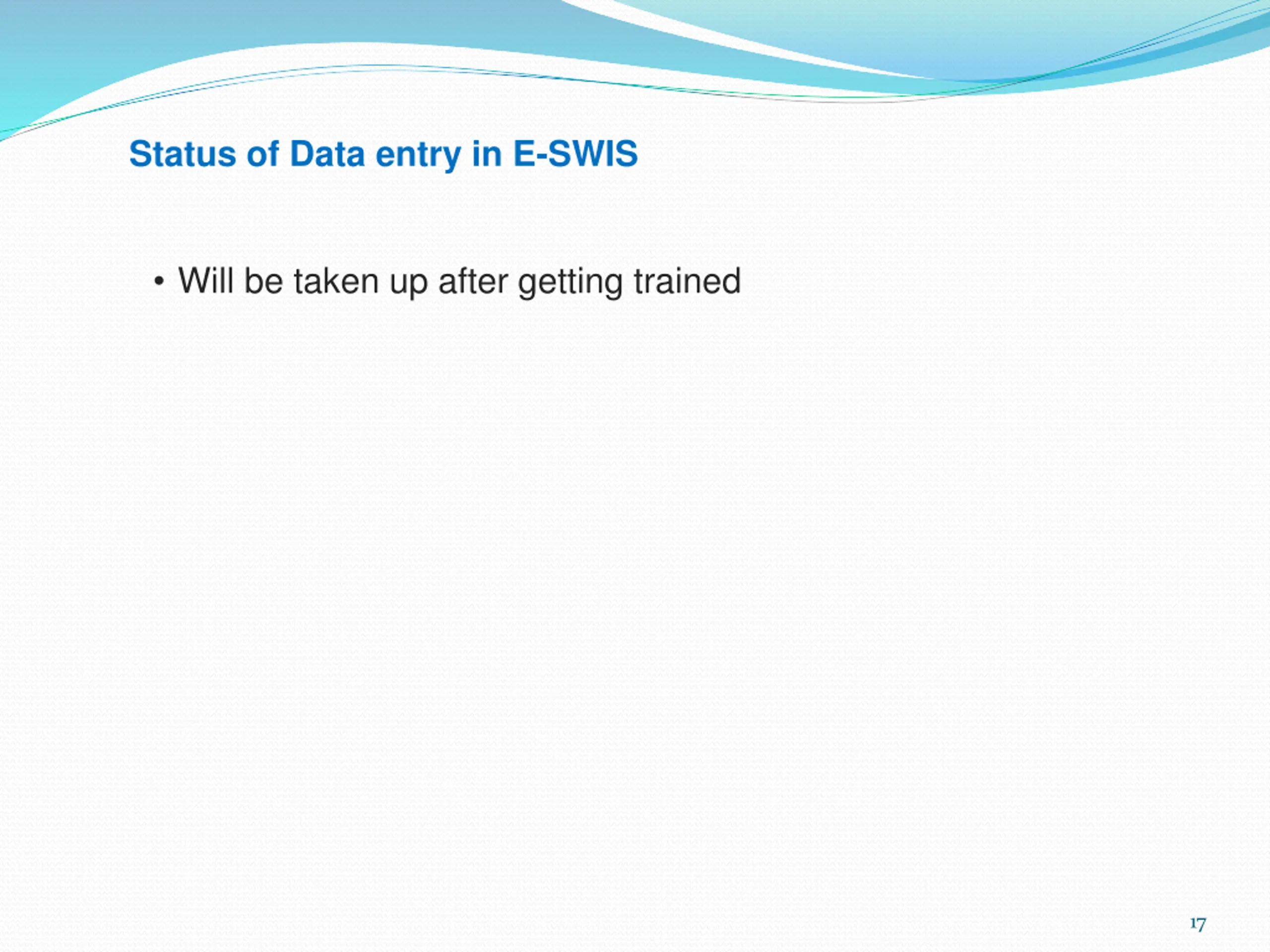 Status of Data entry in E-SWIS Will be taken up after getting trained 17