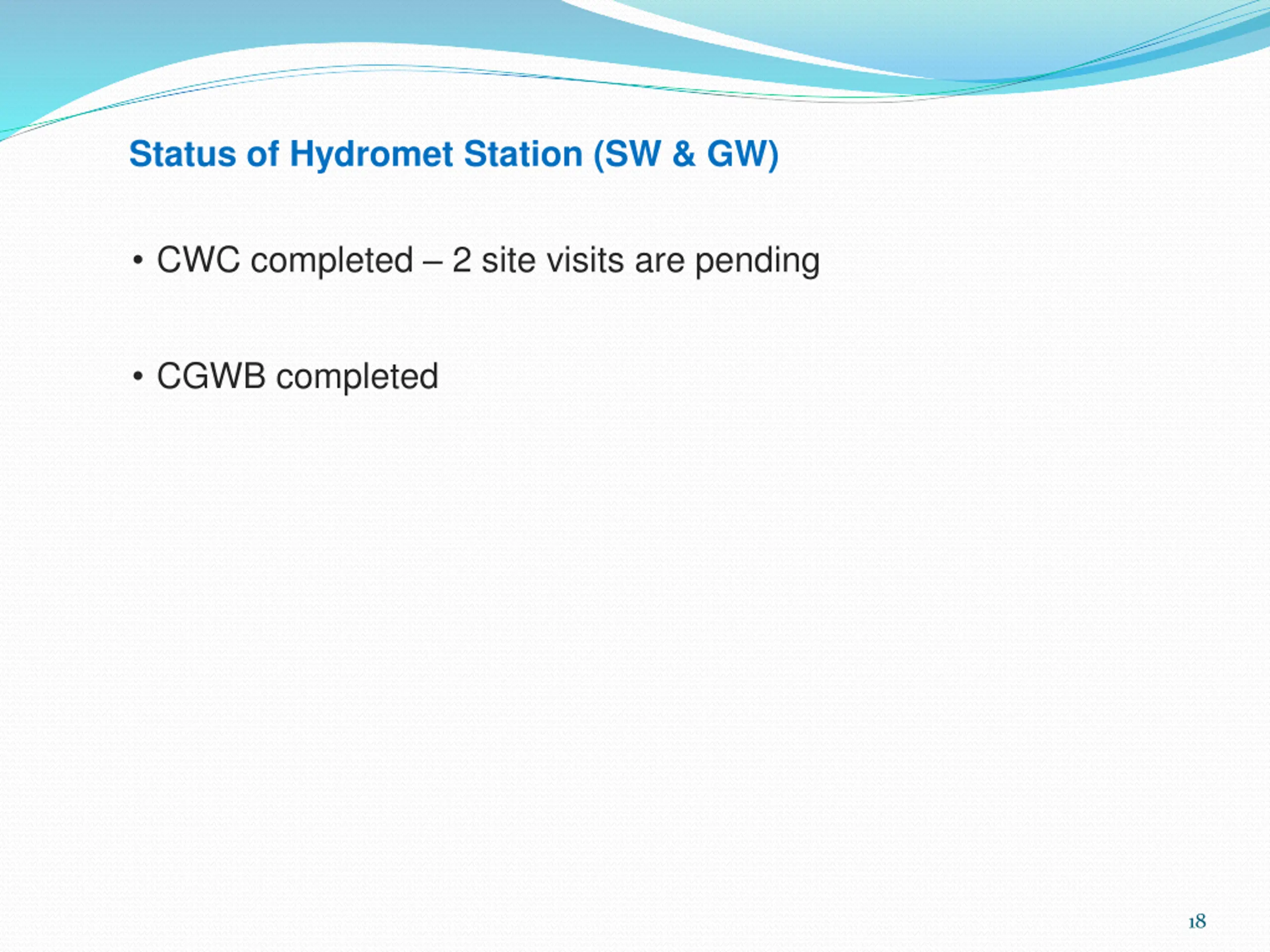 Status of Hydromet Station (SW & GW) CWC completed 2 site visits are pending CGWB completed 18