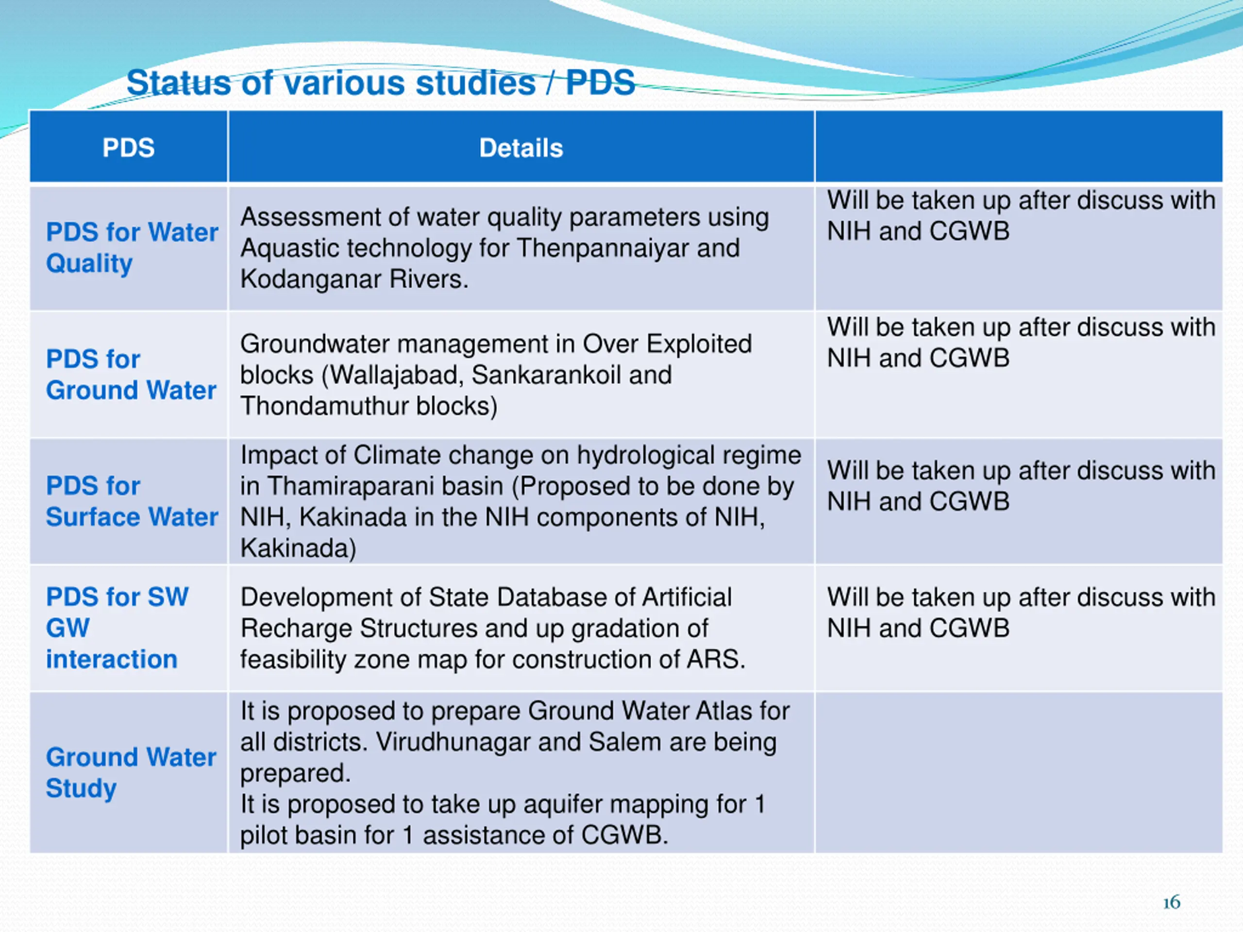 Status of various studies / PDS PDS Details Will be taken up after discuss with NIH and CGWB Assessment of water quality parameters using Aquastic technology for Thenpannaiyar and Kodanganar Rivers. PDS for Water Quality Will be taken up after discuss with NIH and CGWB Groundwater management in Over Exploited blocks (Wallajabad, Sankarankoil and Thondamuthur blocks) PDS for Ground Water Impact of Climate change on hydrological regime in Thamiraparani basin (Proposed to be done by NIH, Kakinada in the NIH components of NIH, Kakinada) Will be taken up after discuss with NIH and CGWB PDS for Surface Water Development of State Database of Artificial Recharge Structures and up gradation of feasibility zone map for construction of ARS. Will be taken up after discuss with NIH and CGWB PDS for SW GW interaction It is proposed to prepare Ground Water Atlas for all districts. Virudhunagar and Salem are being prepared. It is proposed to take up aquifer mapping for 1 pilot basin for 1 assistance of CGWB. Ground Water Study 16