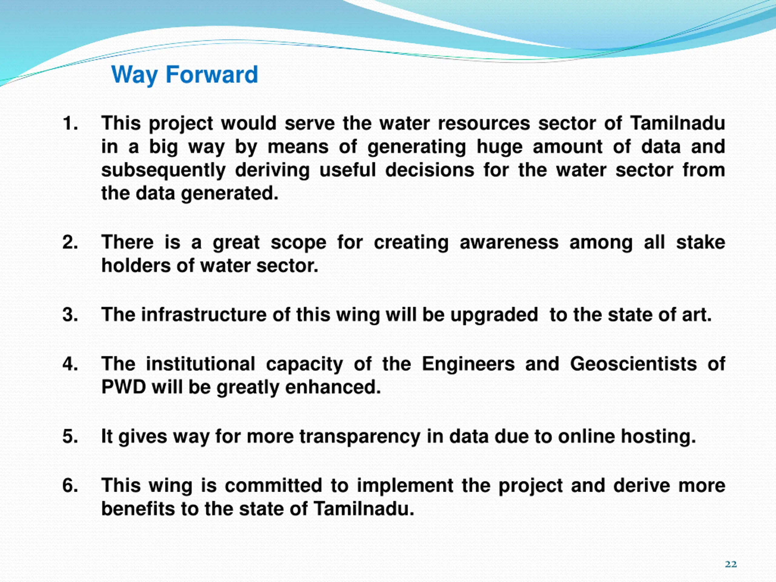 Way Forward 1. This project would serve the water resources sector of Tamilnadu in a big way by means of generating huge amount of data and subsequently deriving useful decisions for the water sector from the data generated. 2. There is a great scope for creating awareness among all stake holders of water sector. 3. The infrastructure of this wing will be upgraded to the state of art. 4. The institutional capacity of the Engineers and Geoscientists of PWD will be greatly enhanced. 5. It gives way for more transparency in data due to online hosting. 6. This wing is committed to implement the project and derive more benefits to the state of Tamilnadu. 22
