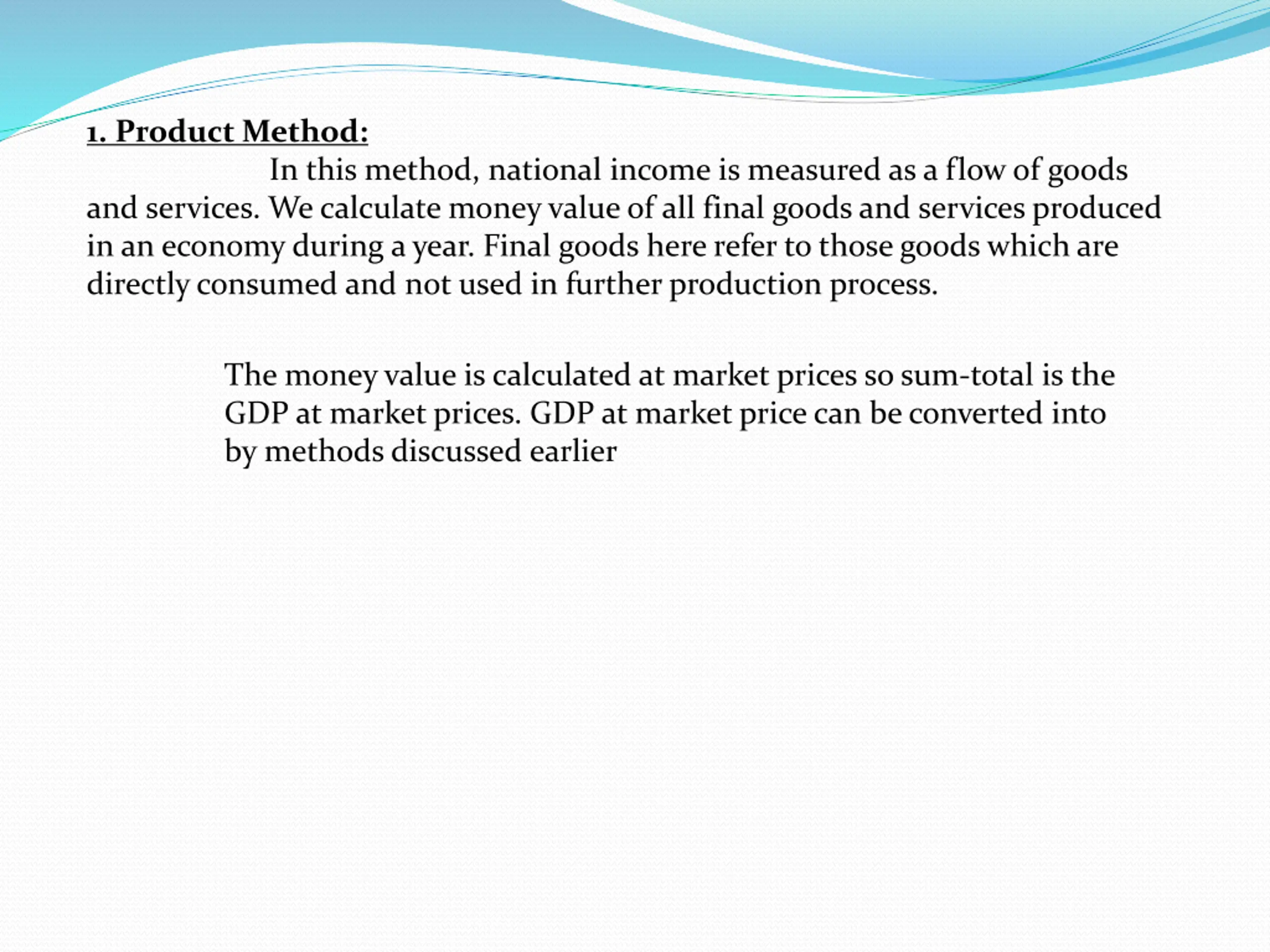 1. Product Method: In this method, national income is measured as a flow of goods and services. We calculate money value of all final goods and services produced in an economy during a year. Final goods here refer to those goods which are directly consumed and not used in further production process. The money value is calculated at market prices so sum-total is the GDP at market prices. GDP at market price can be converted into by methods discussed earlier