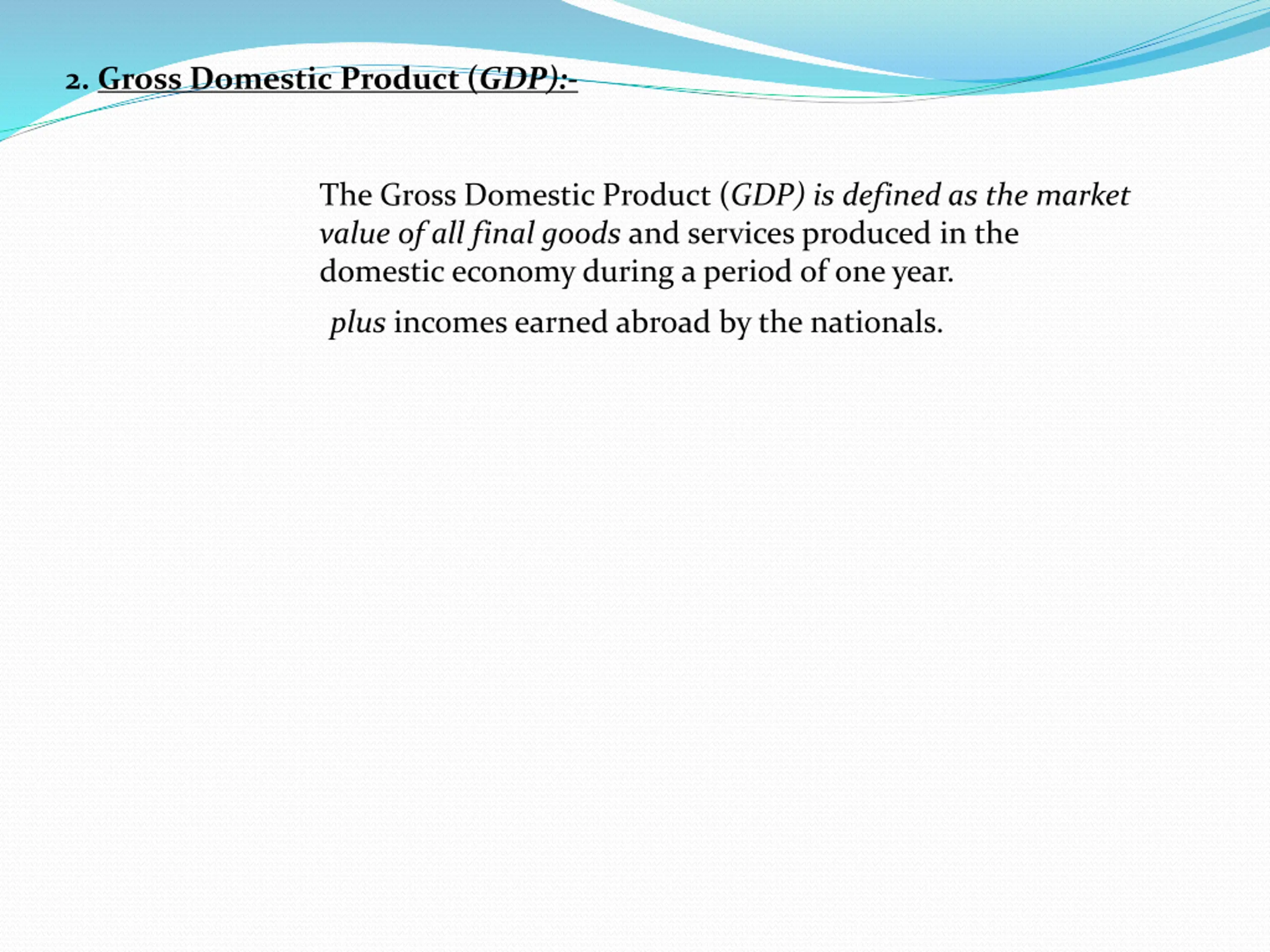 2. Gross Domestic Product (GDP):- The Gross Domestic Product (GDP) is defined as the market value of all final goods and services produced in the domestic economy during a period of one year. plus incomes earned abroad by the nationals.