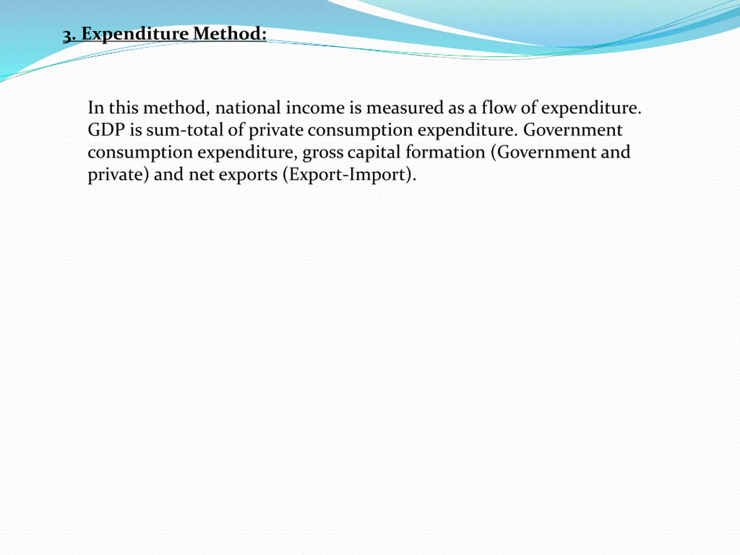 3. Expenditure Method: In this method, national income is measured as a flow of expenditure. GDP is sum-total of private consumption expenditure. Government consumption expenditure, gross capital formation (Government and private) and net exports (Export-Import).