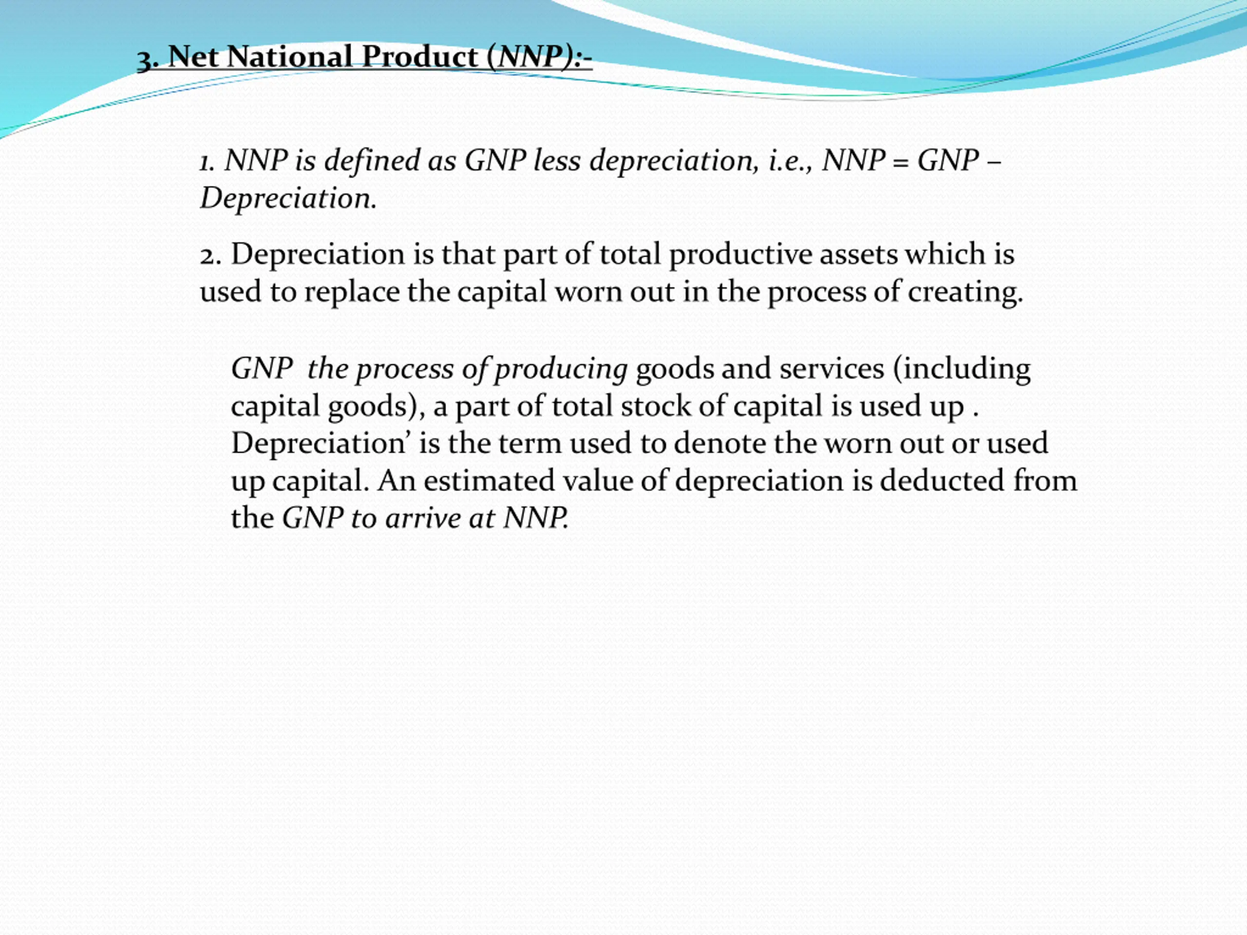3. Net National Product (NNP):- 1. NNP is defined as GNP less depreciation, i.e., NNP = GNP Depreciation. 2. Depreciation is that part of total productive assets which is used to replace the capital worn out in the process of creating. GNP the process of producing goods and services (including capital goods), a part of total stock of capital is used up . Depreciation is the term used to denote the worn out or used up capital. An estimated value of depreciation is deducted from the GNP to arrive at NNP.