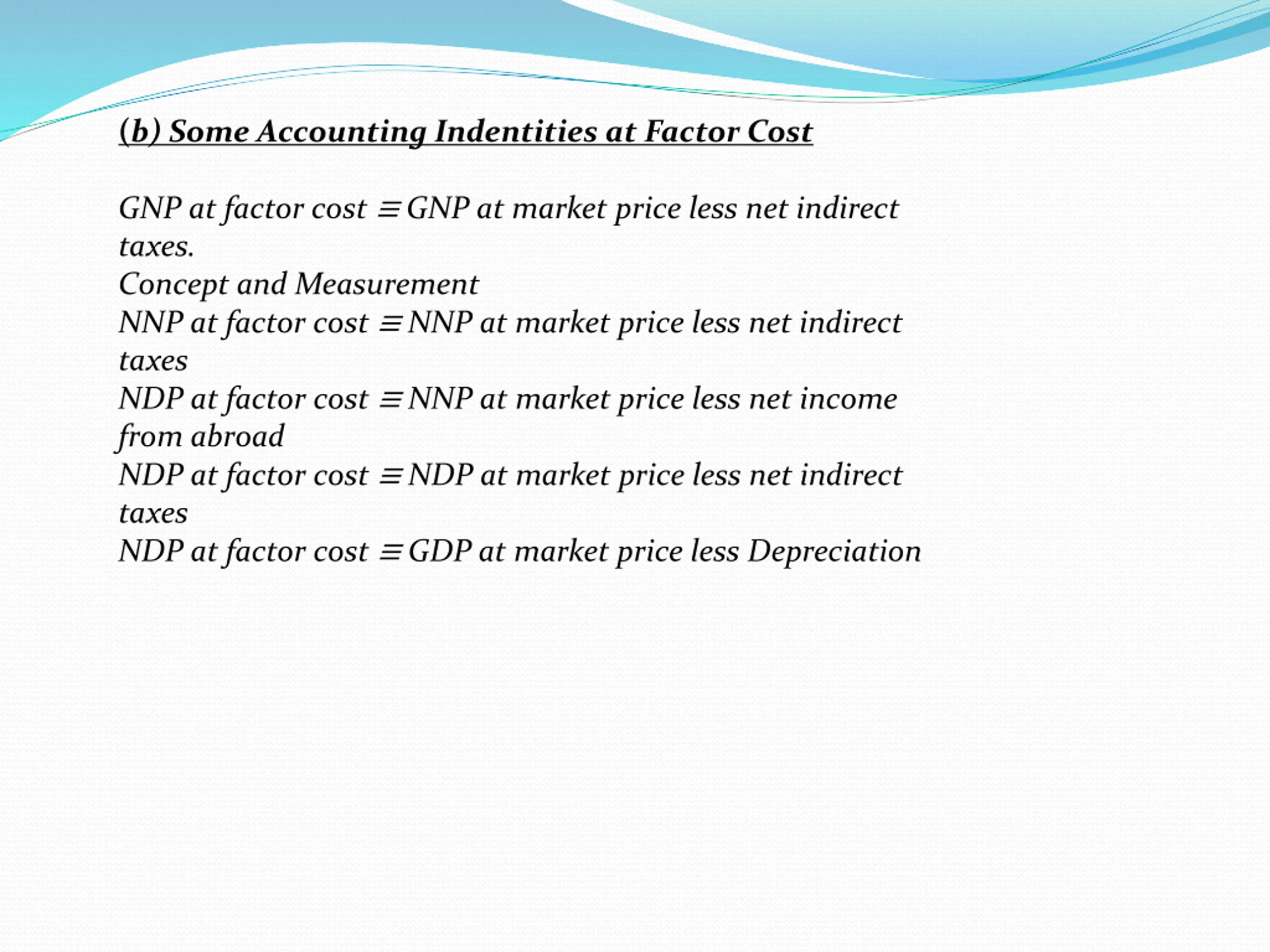 (b) Some Accounting Indentities at Factor Cost GNP at factor cost GNP at market price less net indirect taxes. Concept and Measurement NNP at factor cost NNP at market price less net indirect taxes NDP at factor cost NNP at market price less net income from abroad NDP at factor cost NDP at market price less net indirect taxes NDP at factor cost GDP at market price less Depreciation