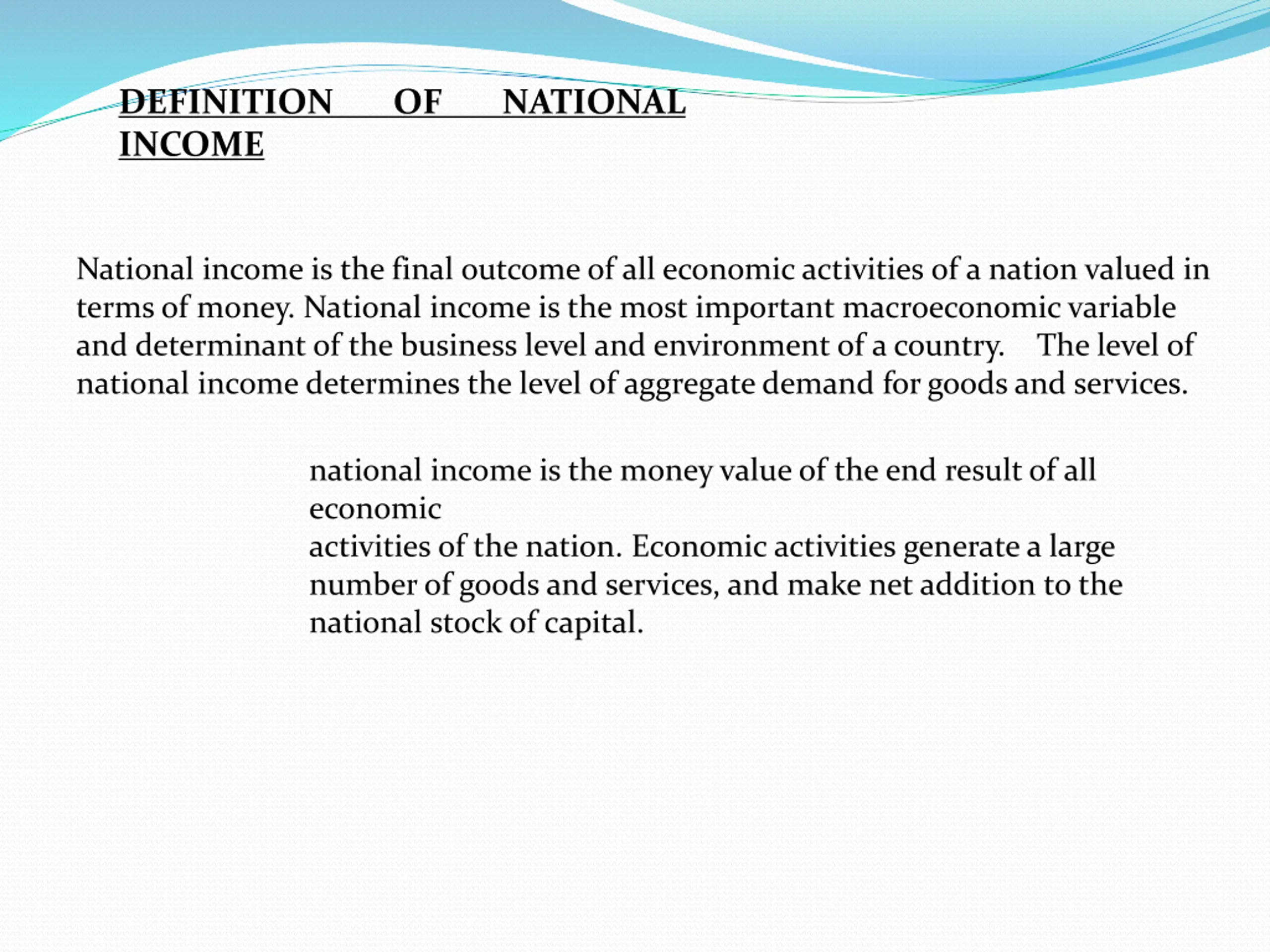 DEFINITION INCOME OF NATIONAL National income is the final outcome of all economic activities of a nation valued in terms of money. National income is the most important macroeconomic variable and determinant of the business level and environment of a country. The level of national income determines the level of aggregate demand for goods and services. national income is the money value of the end result of all economic activities of the nation. Economic activities generate a large number of goods and services, and make net addition to the national stock of capital.
