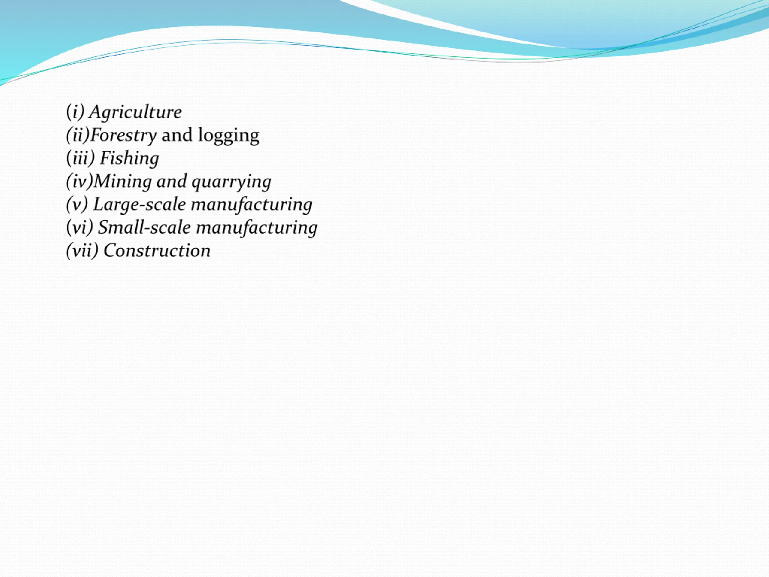 (i) Agriculture (ii)Forestry and logging (iii) Fishing (iv)Mining and quarrying (v) Large-scale manufacturing (vi) Small-scale manufacturing (vii) Construction