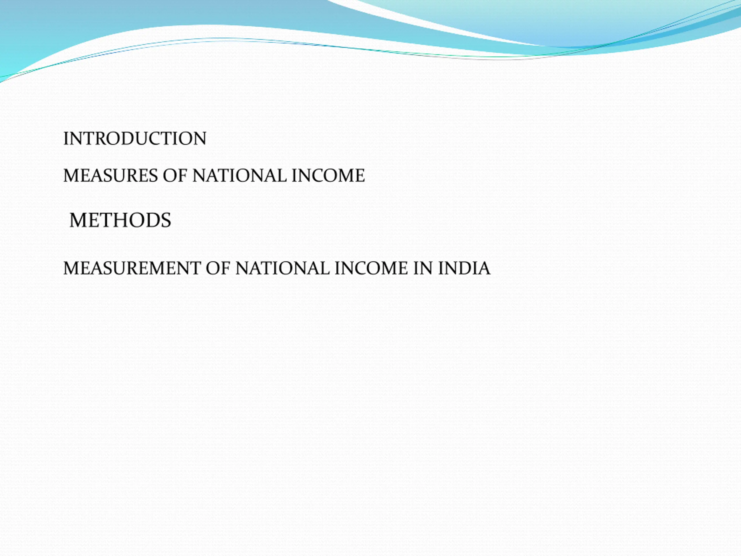 INTRODUCTION MEASURES OF NATIONAL INCOME METHODS MEASUREMENT OF NATIONAL INCOME IN INDIA