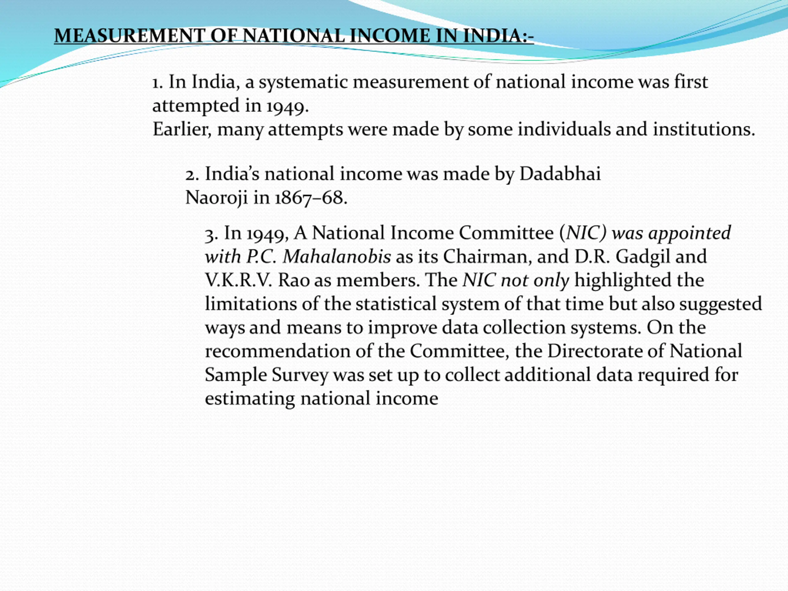 MEASUREMENT OF NATIONAL INCOME IN INDIA:- 1. In India, a systematic measurement of national income was first attempted in 1949. Earlier, many attempts were made by some individuals and institutions. 2. India s national income was made by Dadabhai Naoroji in 1867 68. 3. In 1949, A National Income Committee (NIC) was appointed with P.C. Mahalanobis as its Chairman, and D.R. Gadgil and V.K.R.V. Rao as members. The NIC not only highlighted the limitations of the statistical system of that time but also suggested ways and means to improve data collection systems. On the recommendation of the Committee, the Directorate of National Sample Survey was set up to collect additional data required for estimating national income