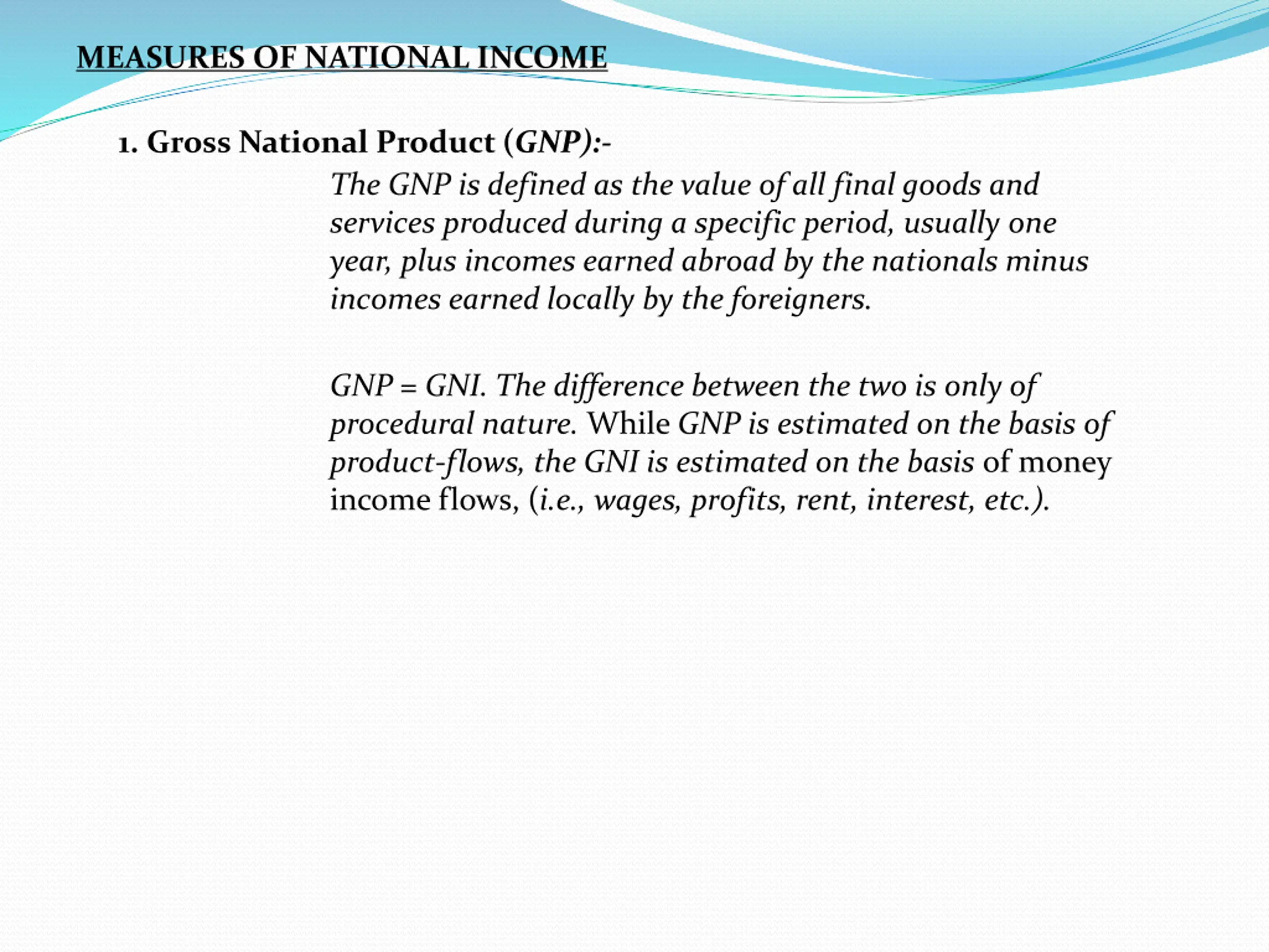 MEASURES OF NATIONAL INCOME 1. Gross National Product (GNP):- The GNP is defined as the value of all final goods and services produced during a specific period, usually one year, plus incomes earned abroad by the nationals minus incomes earned locally by the foreigners. GNP = GNI. The difference between the two is only of procedural nature. While GNP is estimated on the basis of product-flows, the GNI is estimated on the basis of money income flows, (i.e., wages, profits, rent, interest, etc.).