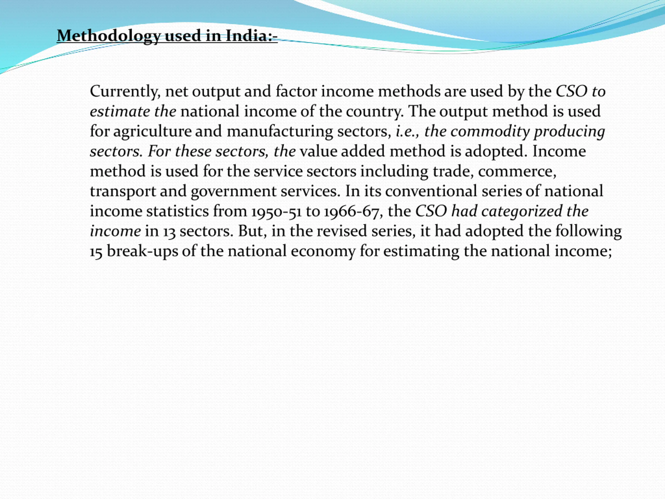 Methodology used in India:- Currently, net output and factor income methods are used by the CSO to estimate the national income of the country. The output method is used for agriculture and manufacturing sectors, i.e., the commodity producing sectors. For these sectors, the value added method is adopted. Income method is used for the service sectors including trade, commerce, transport and government services. In its conventional series of national income statistics from 1950-51 to 1966-67, the CSO had categorized the income in 13 sectors. But, in the revised series, it had adopted the following 15 break-ups of the national economy for estimating the national income;