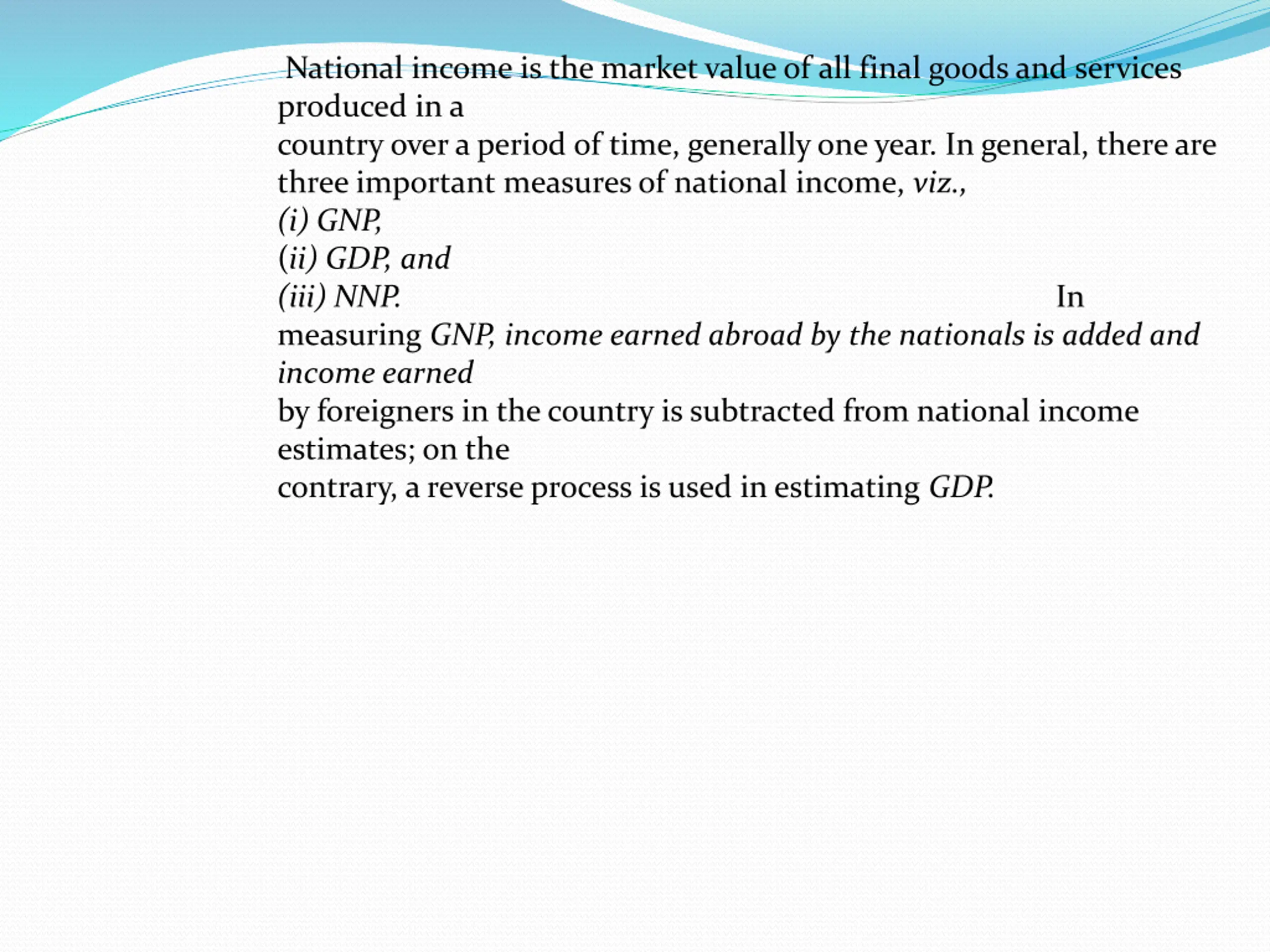 National income is the market value of all final goods and services produced in a country over a period of time, generally one year. In general, there are three important measures of national income, viz., (i) GNP, (ii) GDP, and (iii) NNP. In measuring GNP, income earned abroad by the nationals is added and income earned by foreigners in the country is subtracted from national income estimates; on the contrary, a reverse process is used in estimating GDP.