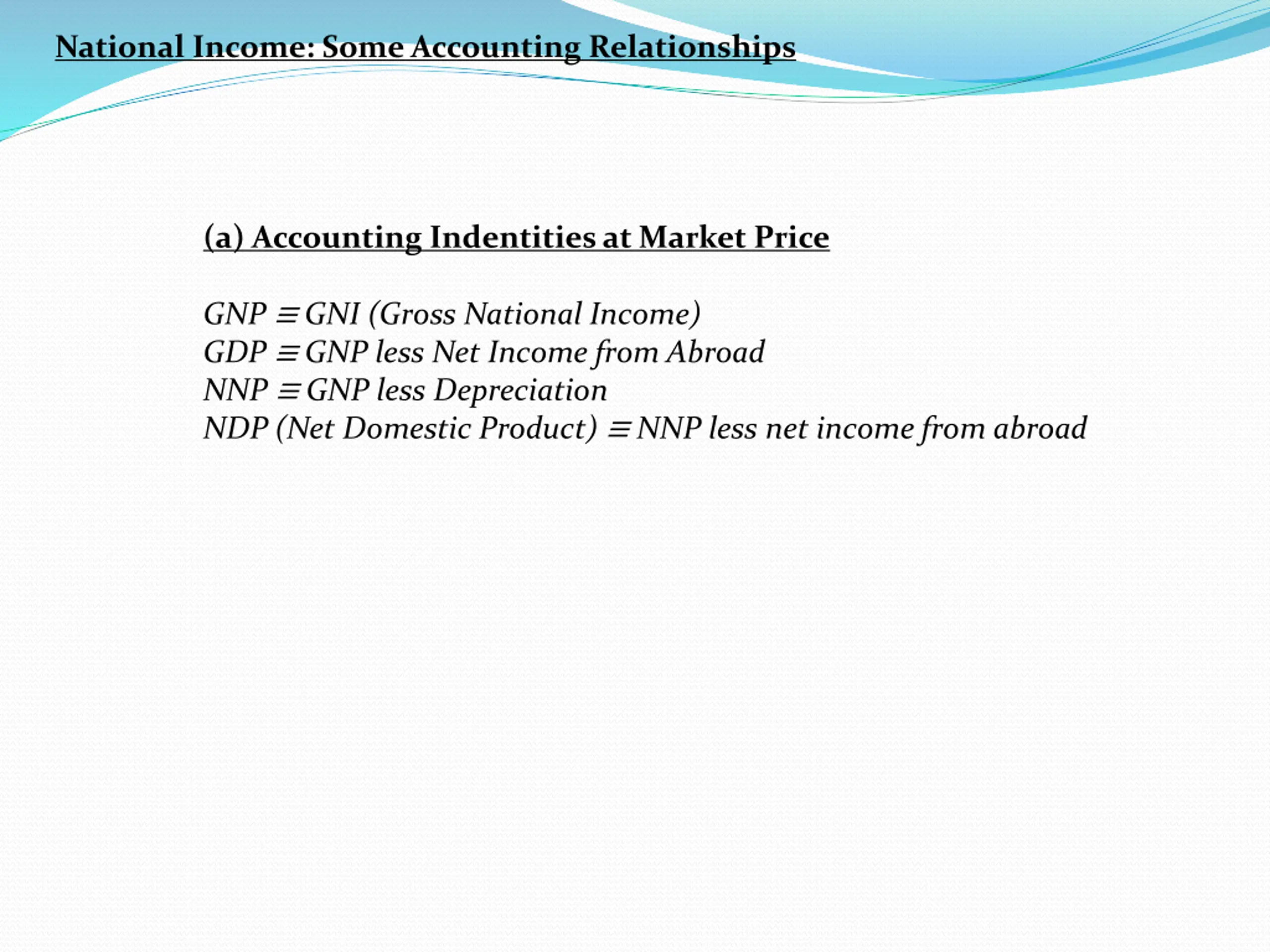 National Income: Some Accounting Relationships (a) Accounting Indentities at Market Price GNP GNI (Gross National Income) GDP GNP less Net Income from Abroad NNP GNP less Depreciation NDP (Net Domestic Product) NNP less net income from abroad