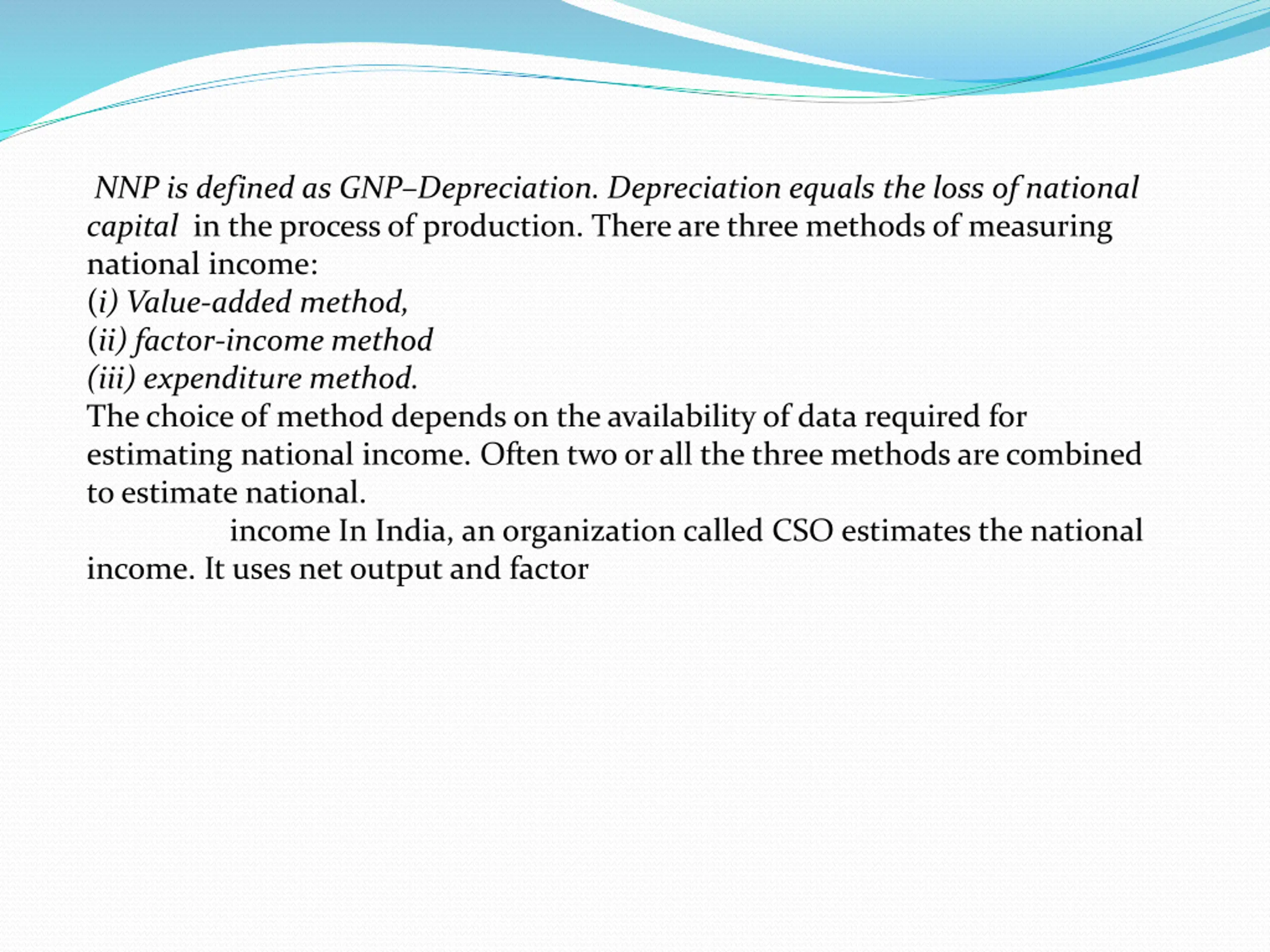 NNP is defined as GNPDepreciation. Depreciation equals the loss of national capital in the process of production. There are three methods of measuring national income: (i) Value-added method, (ii) factor-income method (iii) expenditure method. The choice of method depends on the availability of data required for estimating national income. Often two or all the three methods are combined to estimate national. income In India, an organization called CSO estimates the national income. It uses net output and factor