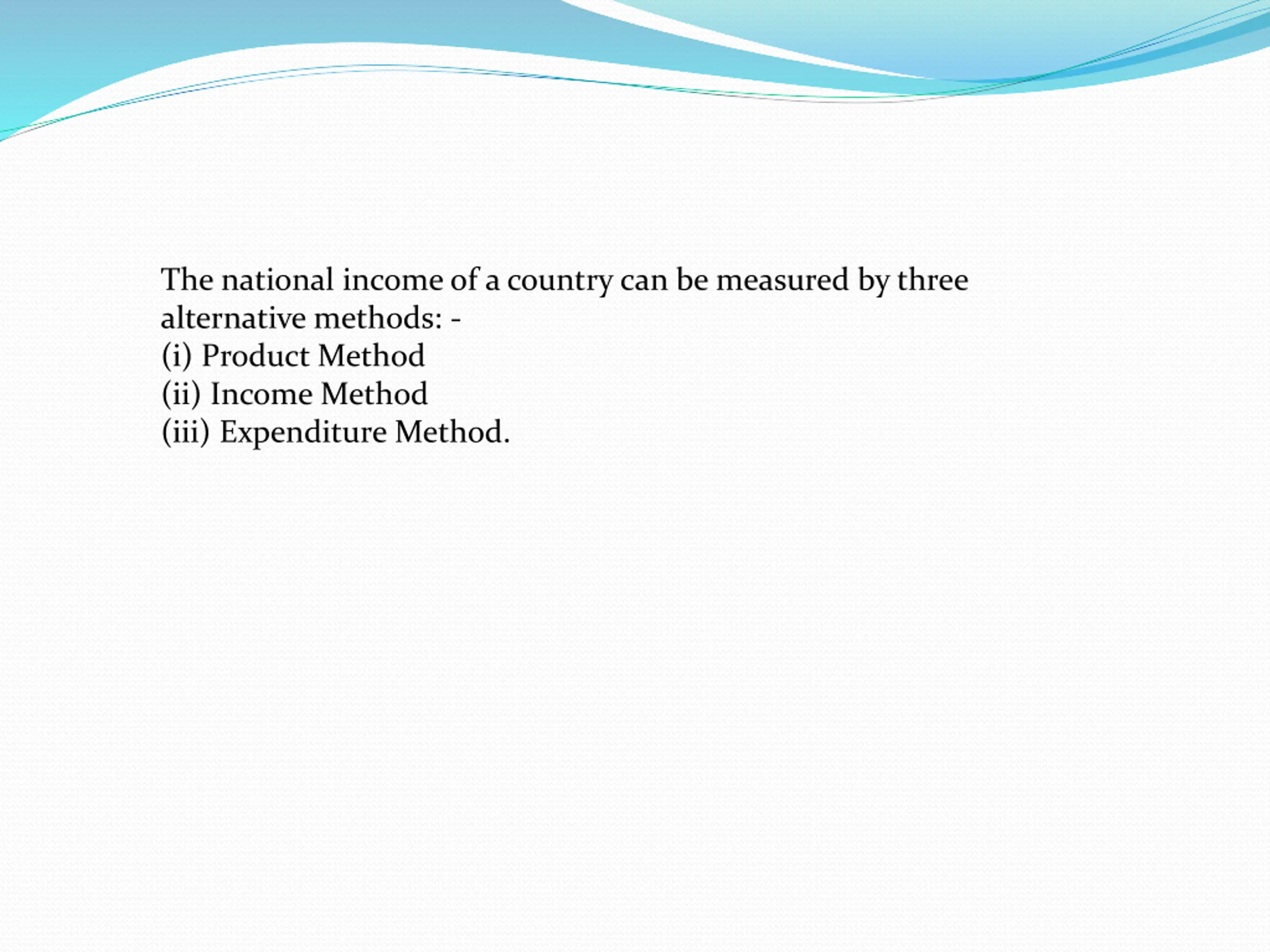 The national income of a country can be measured by three alternative methods: - (i) Product Method (ii) Income Method (iii) Expenditure Method.