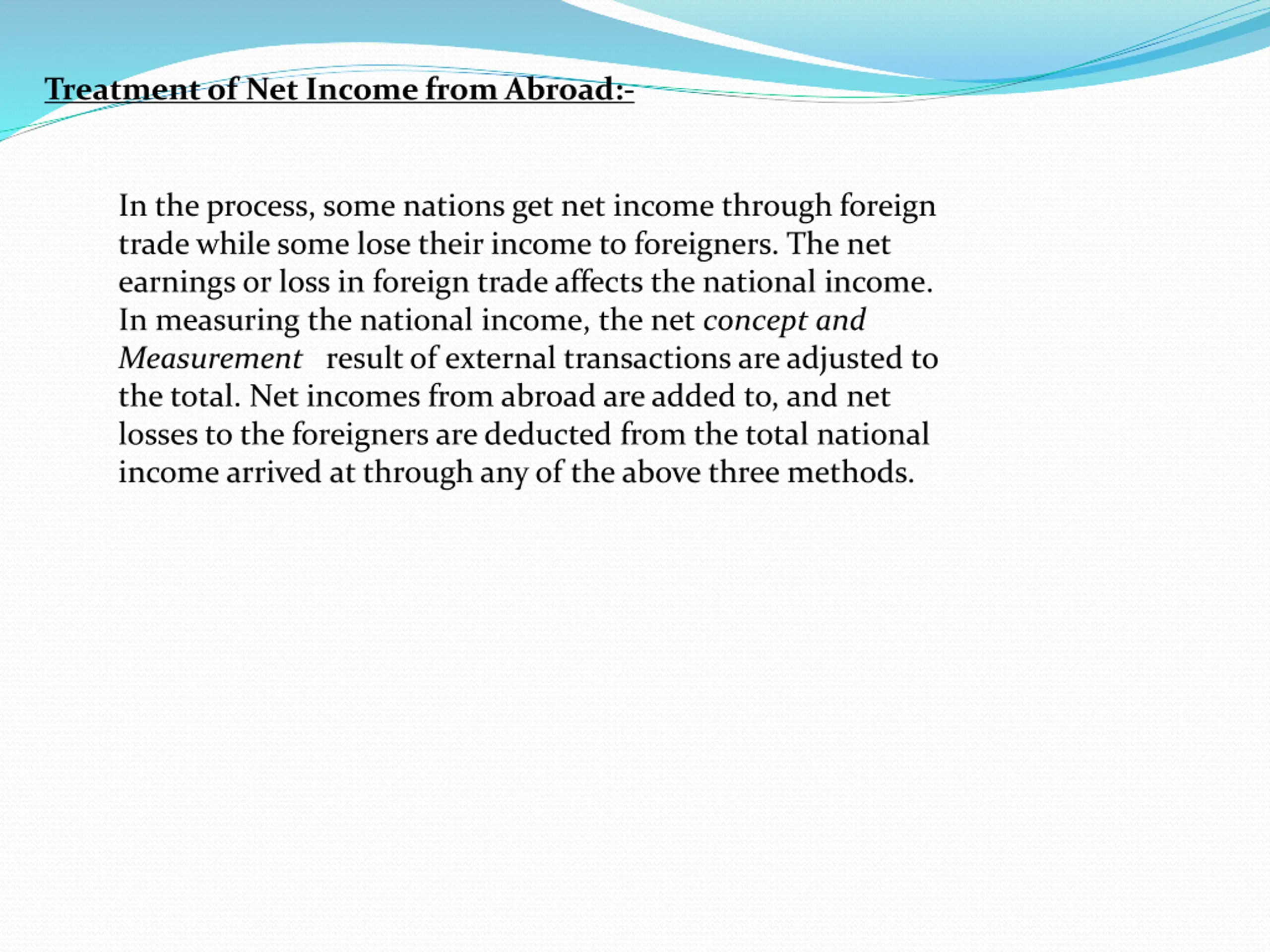 Treatment of Net Income from Abroad:- In the process, some nations get net income through foreign trade while some lose their income to foreigners. The net earnings or loss in foreign trade affects the national income. In measuring the national income, the netconcept and Measurement result of external transactions are adjusted to the total. Net incomes from abroad are added to, and net losses to the foreigners are deducted from the total national income arrived at through any of the above three methods.