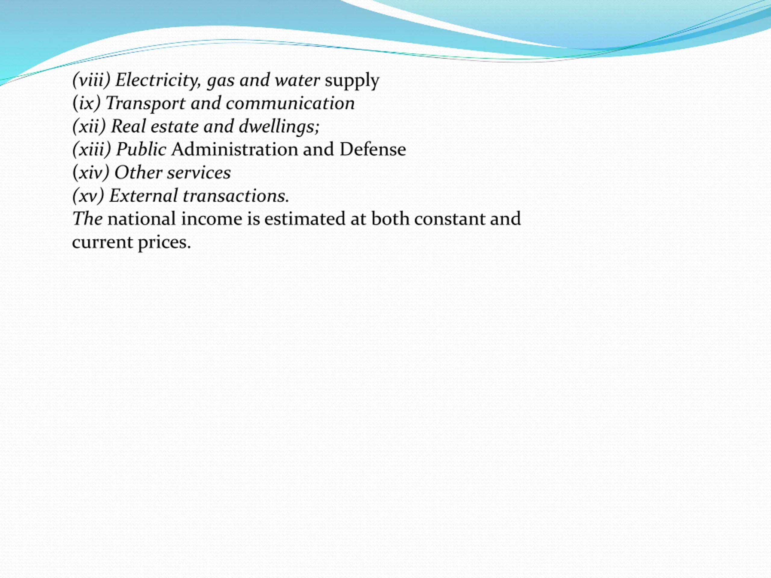 (viii) Electricity, gas and water supply (ix) Transport and communication (xii) Real estate and dwellings; (xiii) Public Administration and Defense (xiv) Other services (xv) External transactions. The national income is estimated at both constant and current prices.