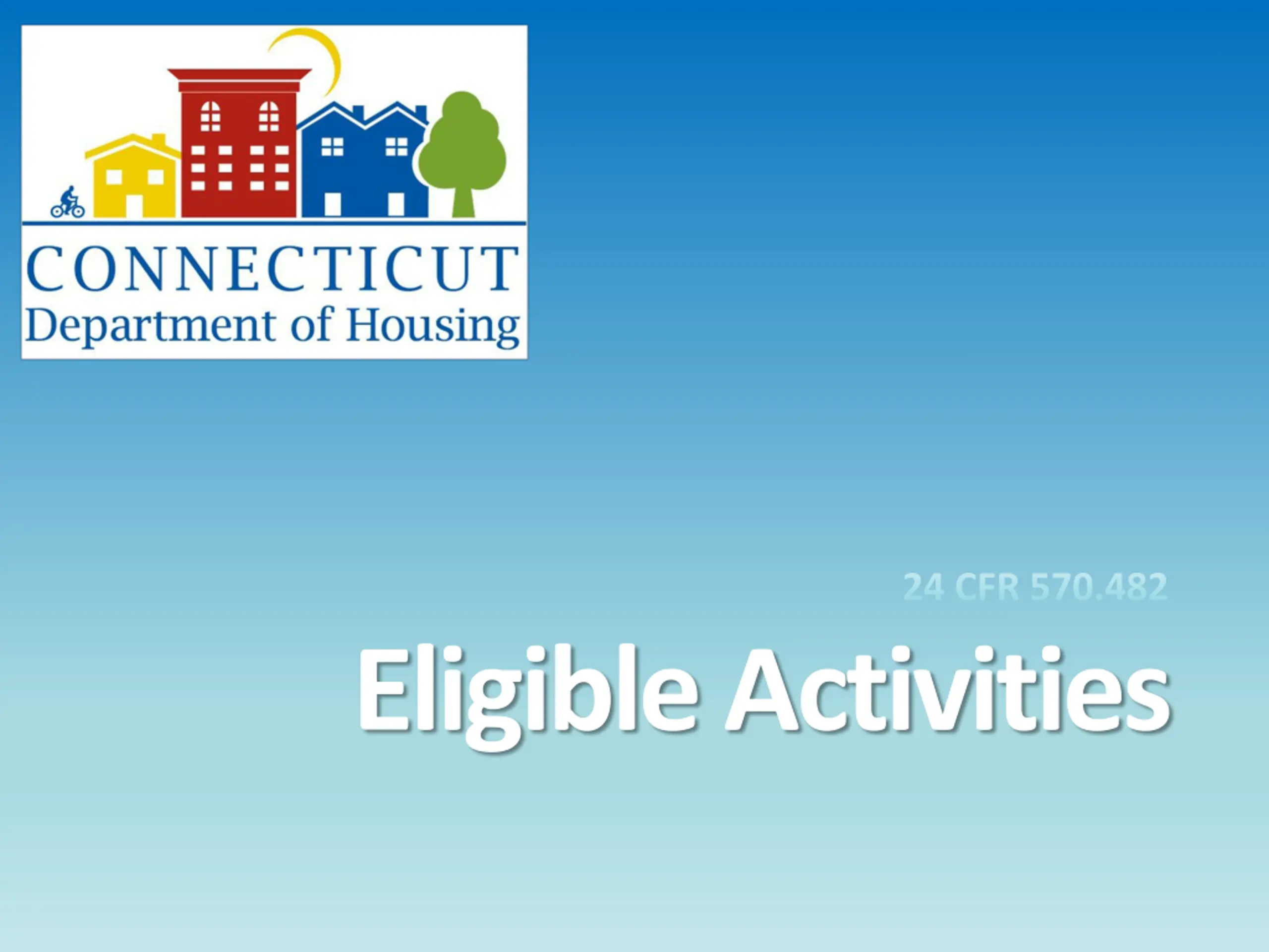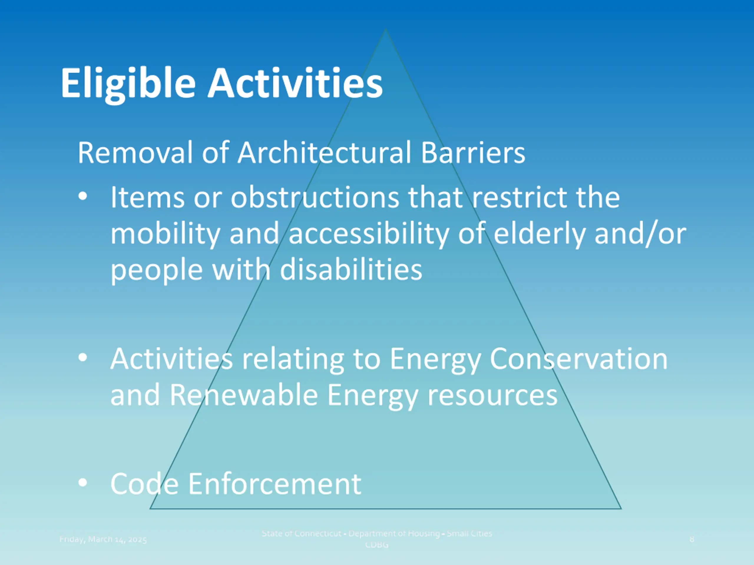 Eligible Activities Removal of Architectural Barriers Items or obstructions that restrict the mobility and accessibility of elderly and/or people with disabilities Activities relating to Energy Conservation and Renewable Energy resources Code Enforcement State of Connecticut - Department of Housing - Small Cities CDBG Friday, March 14, 2025 8